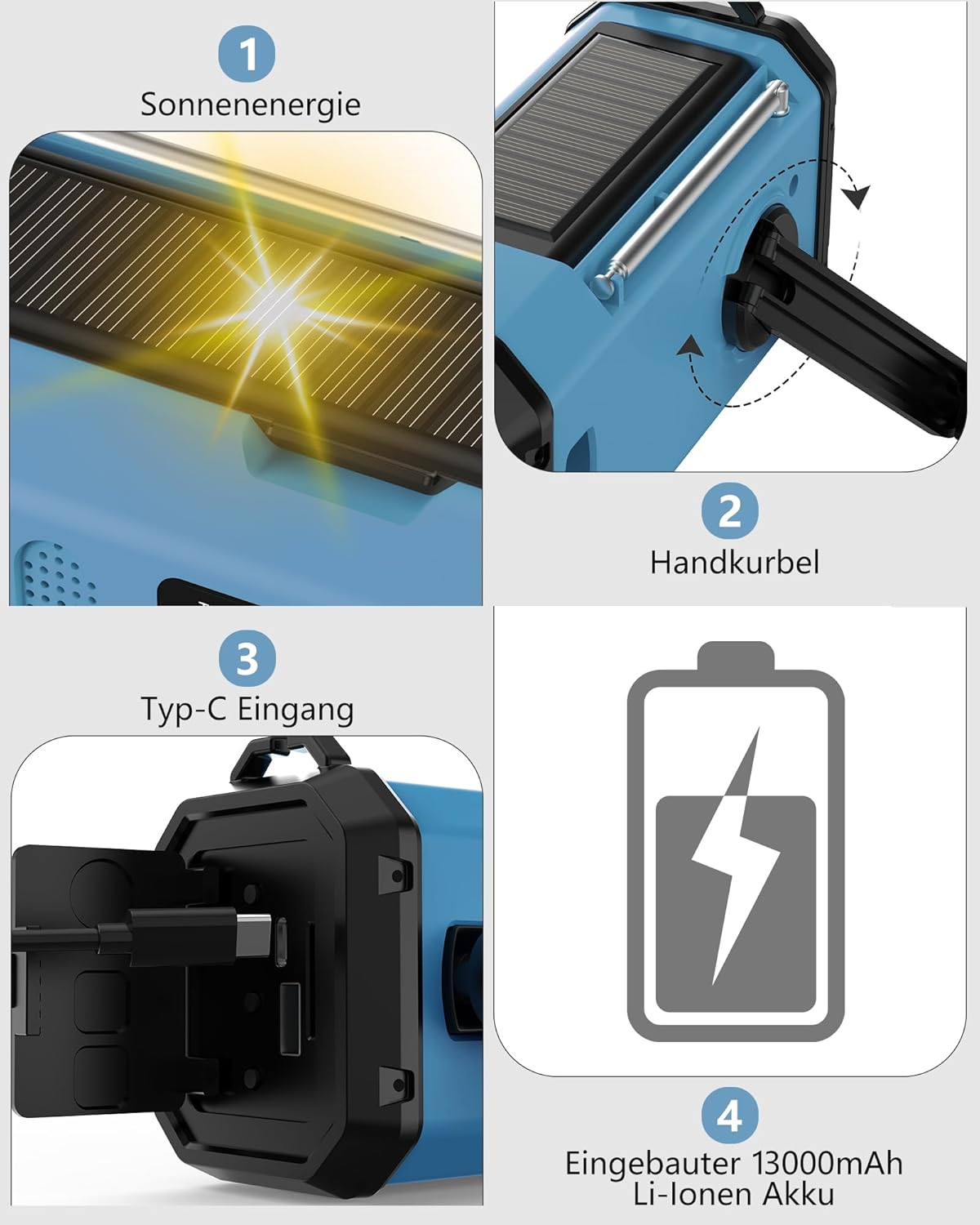 • Без притеснения за захранването – 4 начина за захранване с ясни индикатори за батерията: аварийното радио/устройствата за дейности на открито/оборудването за оцеляване са специално оборудвани с 4 опции за захранване в случай на прекъсване на захранването. Вградената батерия от 13000 mAh и 4 кристално ясни индикатора за захранване показват оставащия заряд на батерията, AM FM радиото се зарежда без усилие чрез ръчната дръжка за навиване/слънчевия панел/включения кабел за зареждане Type-C. Независимо в каква извънредна ситуация се намирате, това аварийно радио с манивела и слънчева батерия винаги може да осигури безкрайна производителност.