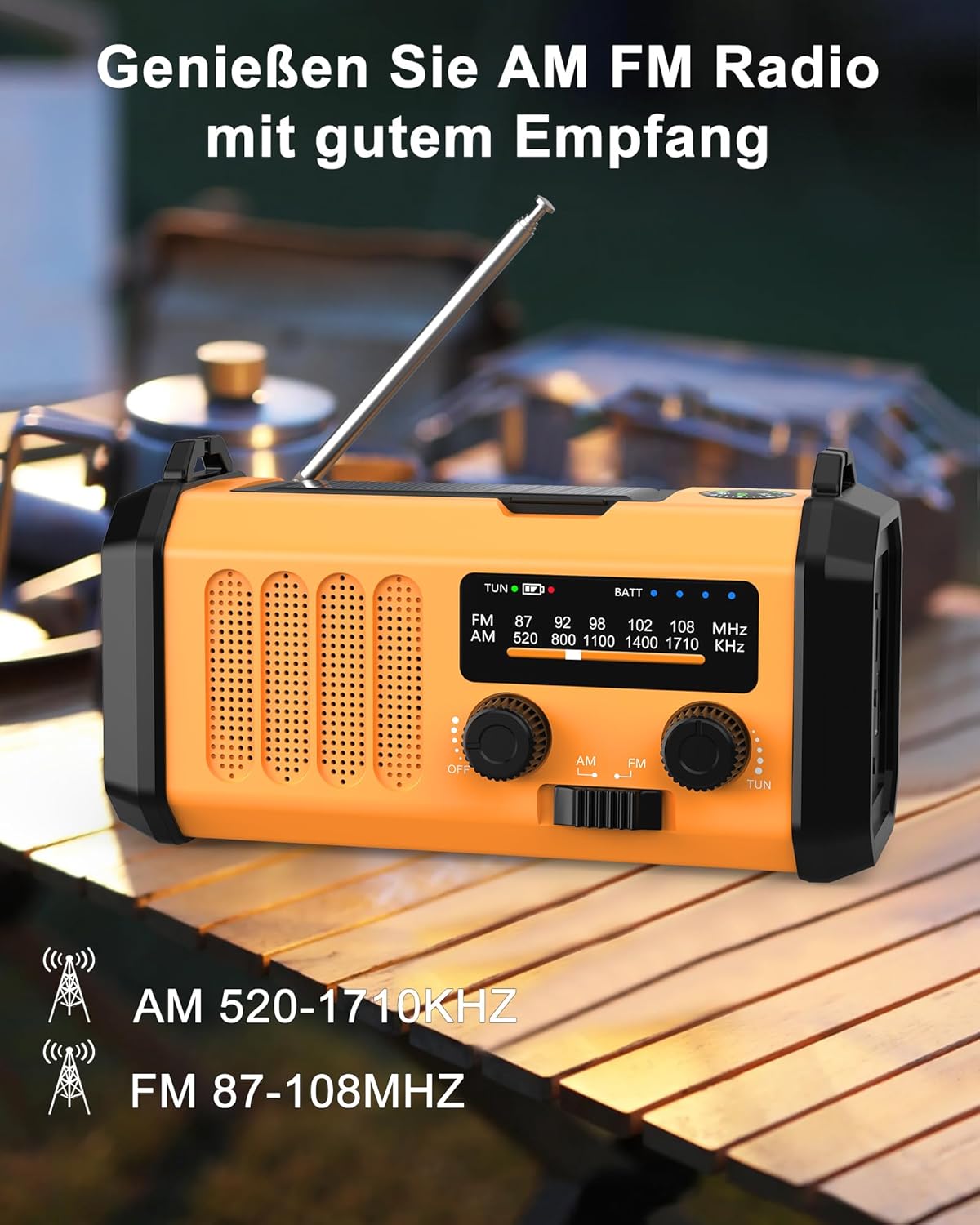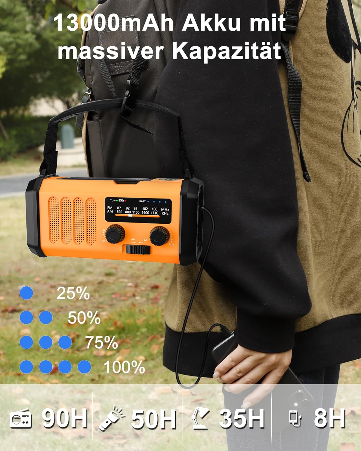 • Практично зарядно устройство за спешни случаи с капацитет 13000 mAh: радиото, работещо с батерии, с подобрена батерия от 13000 mAh с голям капацитет. Това аварийно радио винаги поддържа мобилния ви телефон онлайн в случай на спешност и успокоява тези, които се тревожат за вас. Освен това, радиото с батерии е чудесна алтернатива за любителите на дейности на открито и комплект за спешни случаи, който можете да вземете със себе си за всички ваши пътувания, като къмпинг, туризъм, риболов или други дейности на открито.