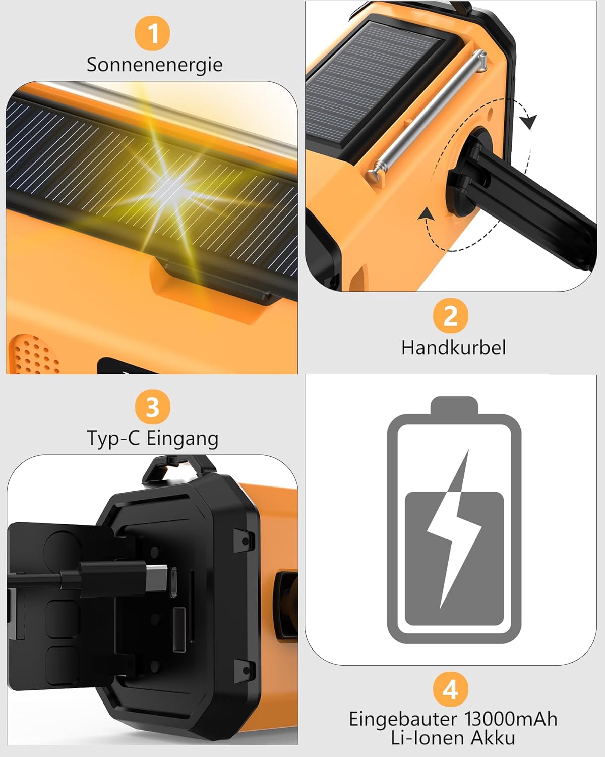 • Без притеснения за захранването – 4 начина за захранване с ясни индикатори за батерията: аварийното радио/устройствата за дейности на открито/оборудването за оцеляване са специално оборудвани с 4 опции за захранване в случай на прекъсване на захранването. Вградената батерия от 13000 mAh и 4 кристално ясни индикатора за захранване показват оставащия заряд на батерията, AM FM радиото се зарежда без усилие чрез ръчната дръжка за навиване/слънчевия панел/включения кабел за зареждане Type-C. Независимо в каква извънредна ситуация се намирате, това аварийно радио с манивела и слънчева батерия винаги може да осигури безкрайна производителност.