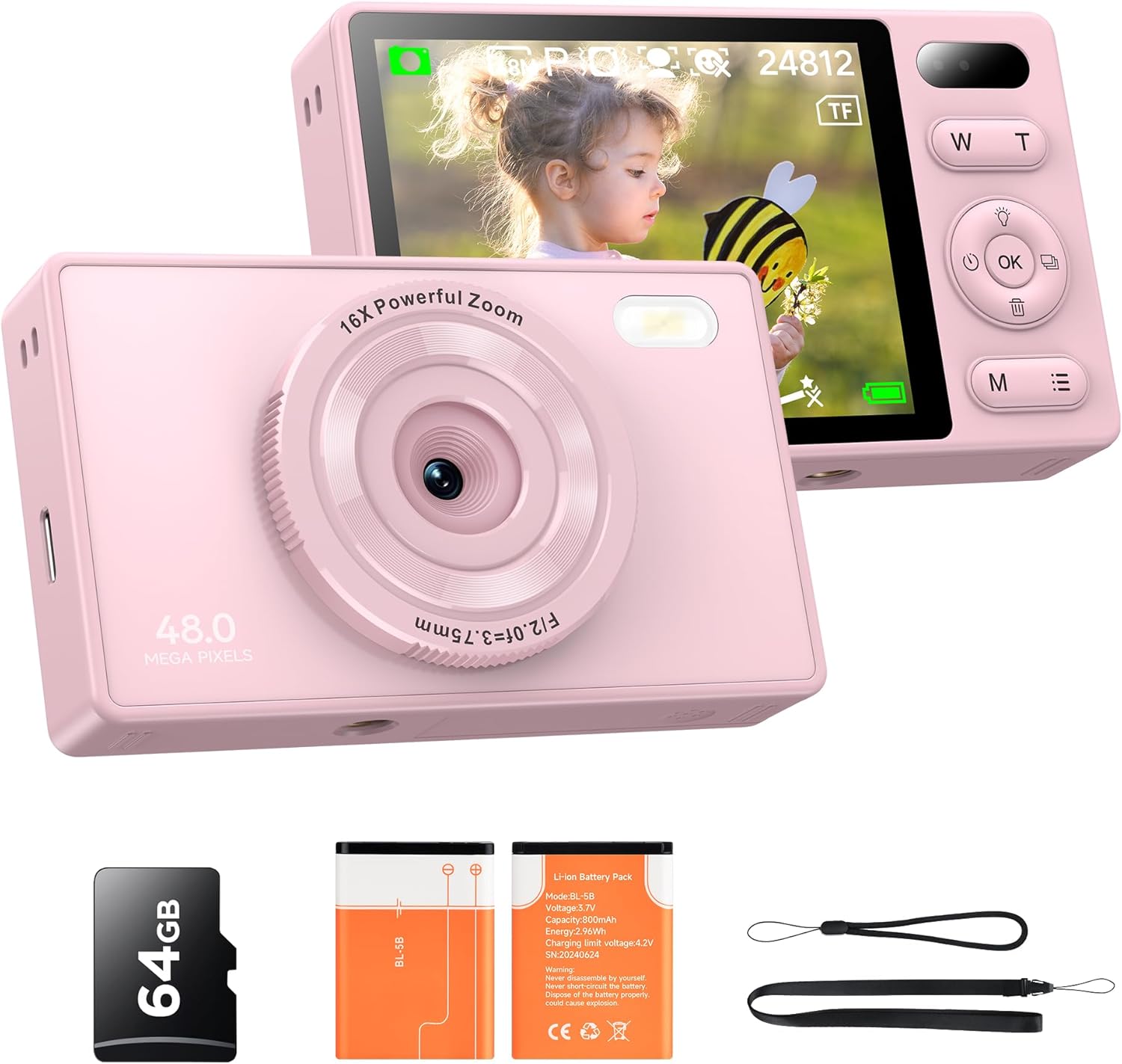 48MP цифров фотоапарат за деца: 64GB анти-трептяща детска камера, фото влог камера за YouTube, 16x цифрово увеличение, селфи фотоапарат, непрекъснато снимане, компактен фотоапарат за...