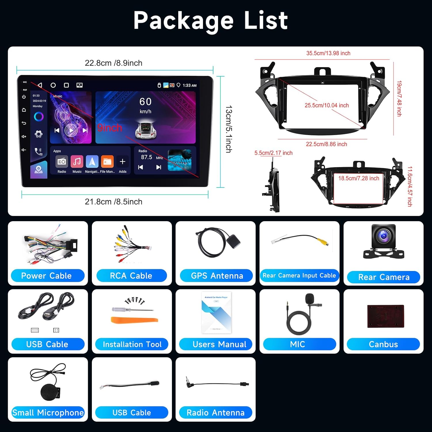 • Други функции и забележка: Управление от волана/Вход за камера за задно виждане/RCA изход/Разделен екран/Гласови настройки/Двоен USB интерфейс/Аудио и видео вход и изход; Моля, сравнете размера и формата на таблото на вашия автомобил с екрана на автомобила за Opel Corsa 2015-2019/Opel Adam 2013-2016 преди монтаж (можете да намерите подробна информация за размера и формата на снимките).