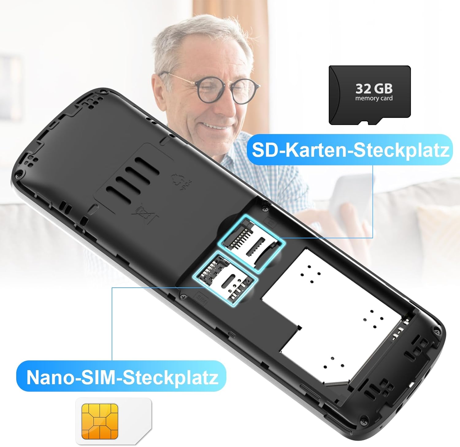 • Здрав 4G мобилен телефон за възрастни хора: с мощна батерия от 1400 mAh, той предлага до 300 минути време за разговори или 300-360 часа работа в режим на готовност - идеален за възрастни хора. Паметта е разширяема (до 32 GB).