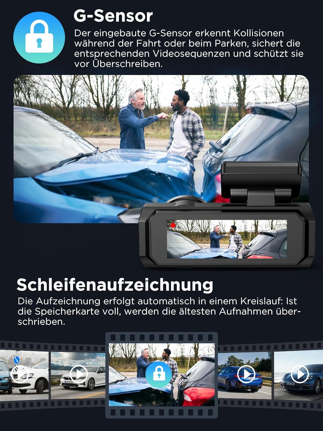 • G-сензор и автоматично заключване: G-сензорът на тази видеокамера има три регулируеми нива на чувствителност, което ѝ позволява да открива удари с различна интензивност. Ниска настройка на чувствителност е достатъчна за ежедневна употреба. След като G-сензорът засече удар, видеокамерата автоматично заключва записа и го запазва на картата с памет, за да предотврати презаписване. Това предоставя важни доказателства за застрахователни искове или съдебни производства в случай на произшествие.