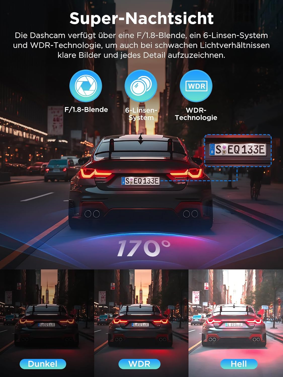 • Отлично нощно виждане: Тази видеокамера за кола разполага с бленда F1.8 и 6-слоен HD обектив, заедно с усъвършенствана технология за запис при слаба светлина. Това гарантира ясни и детайлни видеоклипове дори в тъмното или през нощта, повишавайки безопасността при шофиране. Подобрената WDR технология предоставя ясни изображения с живи цветове и реалистични детайли, като регистрационни номера, пешеходци и пътни знаци – дори при лоши и сложни условия на осветление.