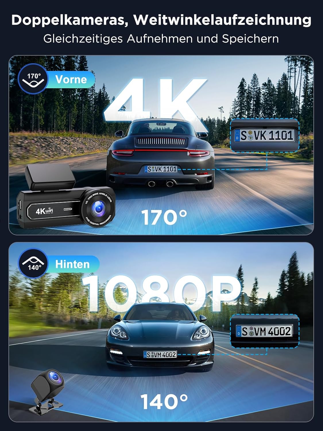 • 4K+1080P Двойна Камера: Тази видеорегистратор с две камери едновременно записва предната и задната част на вашия автомобил в 4K и 1080P резолюция, улавяйки всеки детайл с кристално ясни детайли, включително пътни знаци, регистрационни номера, пешеходци и предупредителни знаци. Двете камери работят независимо, осигурявайки отделни записи за двойна защита на вашата безопасност при шофиране. Те ви помагат да осигурите важни доказателства.