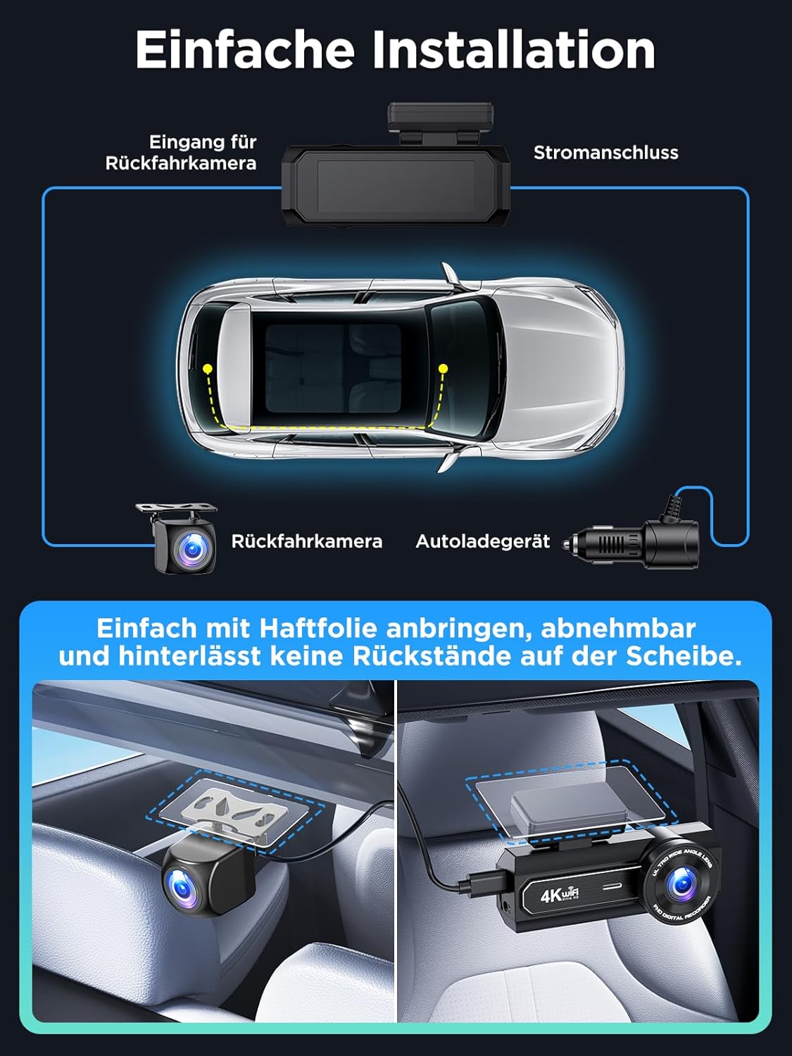 • Installation und Garantie: Die Dashcam wird mit einem antistatischen Aufkleber für eine einfache Installation geliefert. So können Sie sie problemlos in einem anderen Fahrzeug anbringen, ohne Ihre Windschutzscheibe zu verschmutzen. Der Standfuß ist verstellbar und abnehmbar. Wir bieten zwei Jahre Garantie und lebenslangen technischen Support. Sollten Sie Probleme mit der Dashcam haben, kontaktieren Sie uns bitte. Wir helfen Ihnen innerhalb von 24 Stunden.