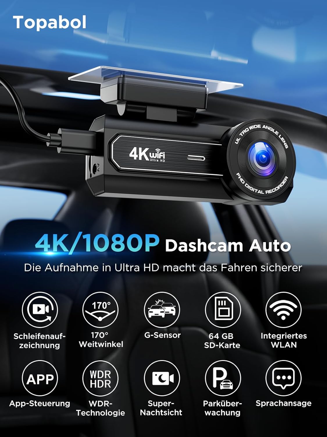 • Intelligente Konnektivität und Steuerung: Die Dashcam verfügt über integriertes WLAN, sodass Sie Ihr Smartphone damit verbinden können. Sie können Ihre Aufnahmen in der App ansehen, wiedergeben, herunterladen und teilen, ohne die Speicherkarte entnehmen zu müssen. Auch die Kamerafunktionen und -parameter sowie das Formatieren der Speicherkarte lassen sich bequem über die App konfigurieren. Sprachansagen erleichtern Ihnen die Bedienung der Dashcam.