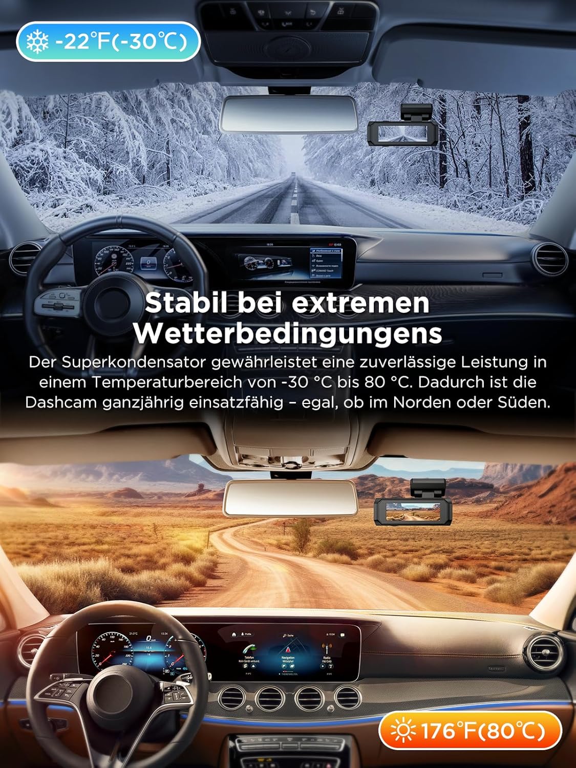 • Kompakt & Langlebig : Mit einem eleganten und unauffälligen Design fügt sich dieses Dashcam nahtlos in Ihr Fahrzeuginterieur ein, ohne die Sicht zu beeinträchtigen. Ausgestattet mit einem hitzebeständigen Chipset und einem robusten Gehäuse, gewährleistet es einen stabilen Betrieb bei extremen Temperaturen von -30°C bis 80°C. Zudem unterstützt es Speicherkarten mit bis zu 256 GB (U1 oder höher).