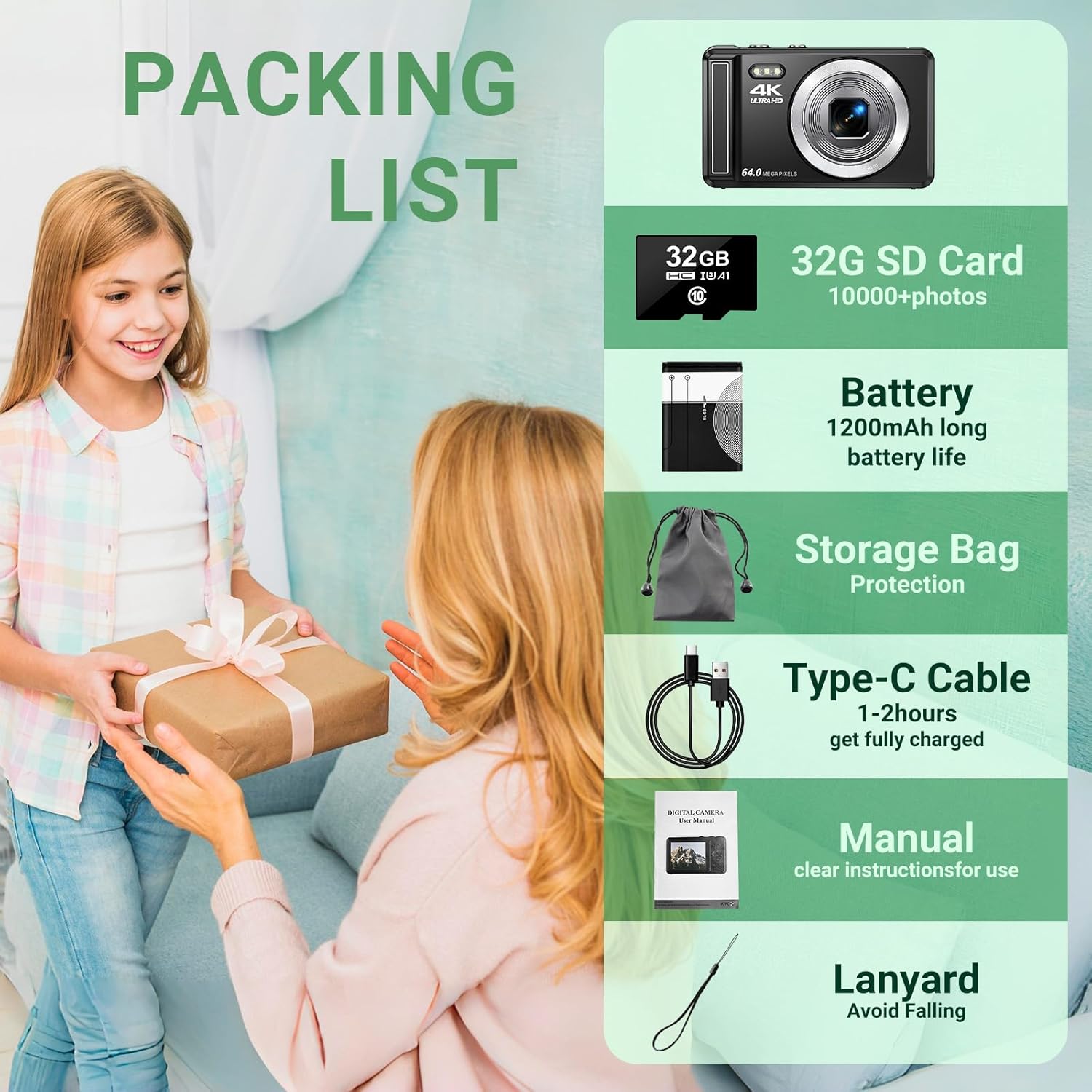 4K 64MP цифров фотоапарат с 32GB TF карта, камера с автофокус и 16X цифрово увеличение, преносим компактен фотоапарат с батерия 1200 mAh, USB кабел, за деца, тийнейджъри, възрастни, начинаещи