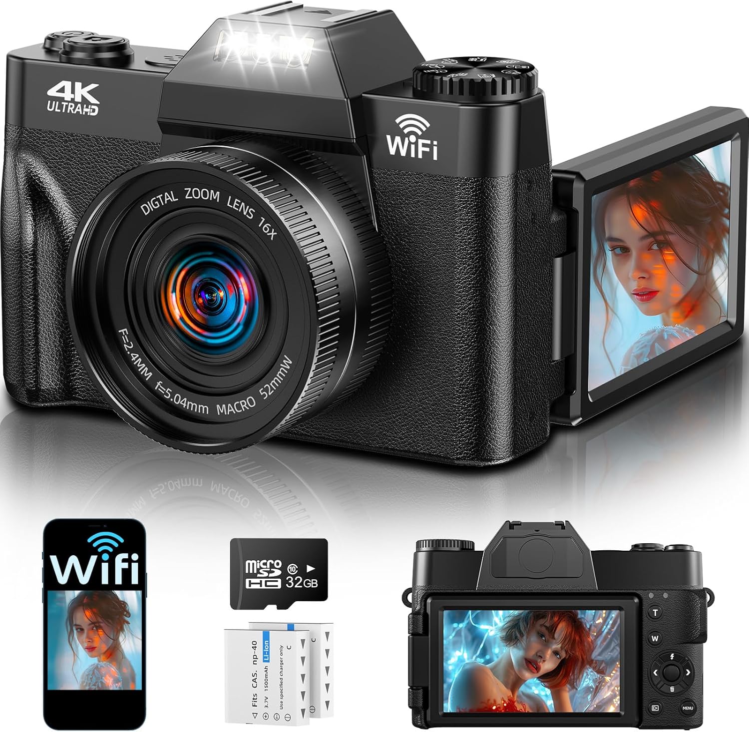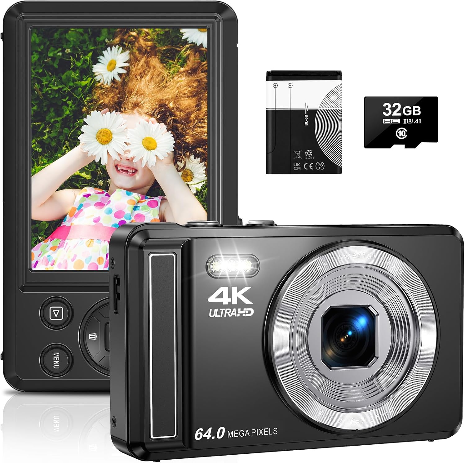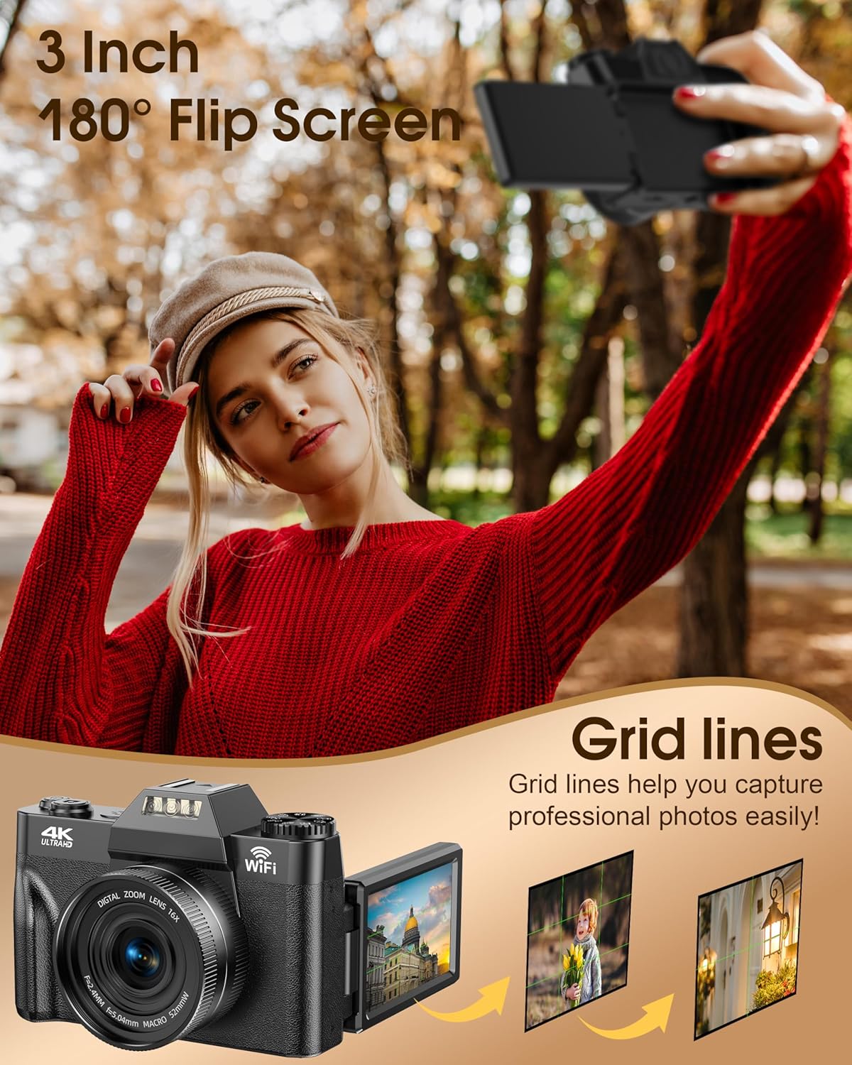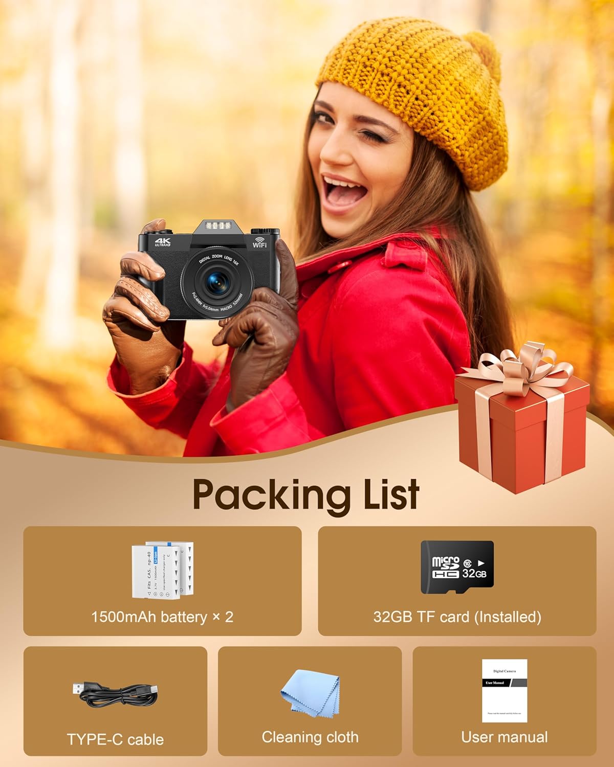 • Автоматичен фокус 4K 75MP цифров фотоапарат: Този 2025 автофокус 4K цифров фотоапарат е оборудван със 75MP изображения и 4K ultra HD видео функция. Той използва най-новия CMOS чип, за да заснеме прецизно всеки вълнуващ момент. Вградената светкавица осигурява висококачествени снимки дори при слаба светлина, идеални за снимки на закрито и на открито. Автоматичният фокус гарантира, че изображенията остават резки дори при силна светлина или движещи се обекти. 16-кратното цифрово увеличение ви позволява да заснемате точно както близки, така и дълги кадри.