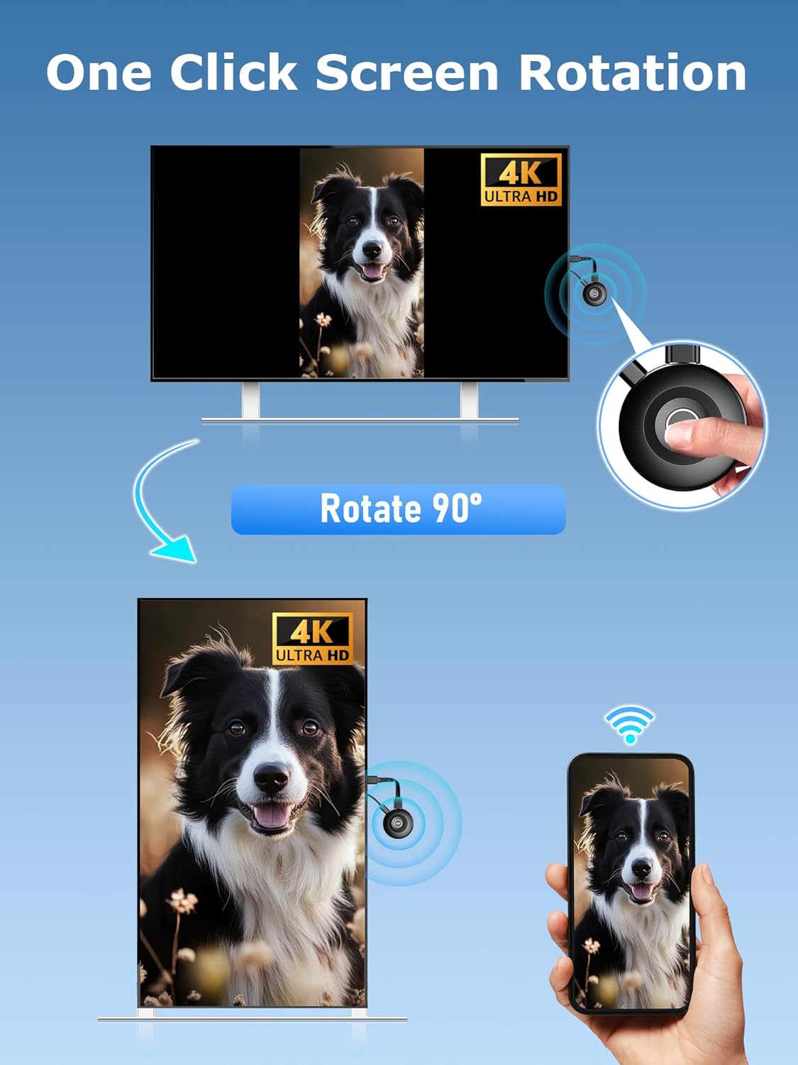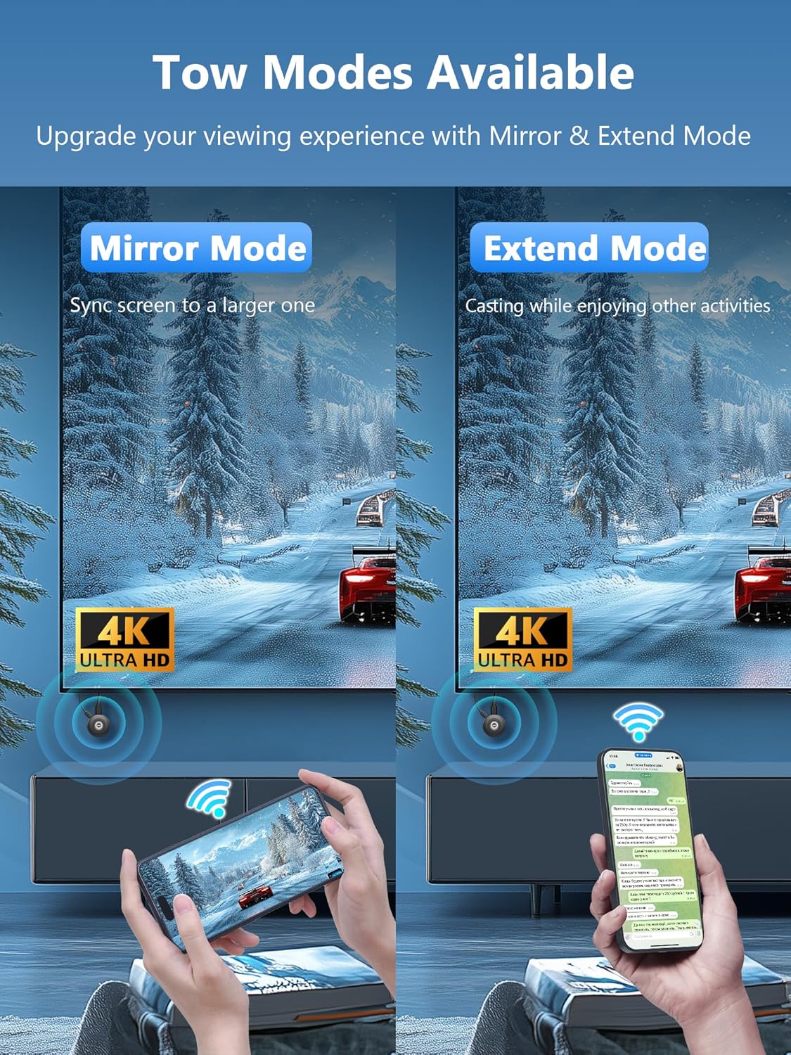 • Гъвкава смяна на екрана: лесно огледално показвайте вашия смартфон на телевизора, за да четете имейли, или разширете компютъра си за многозадачност. Уникалният режим на разширение пести енергия на предаващото устройство по време на дълги стрийминг сесии, осигурявайки непрекъснато забавление и работа. В допълнение, нашият безжичен Wi-Fi приемник поддържа и хоризонтално и вертикално превключване на екрана, за да отговори на вашите различни нужди.