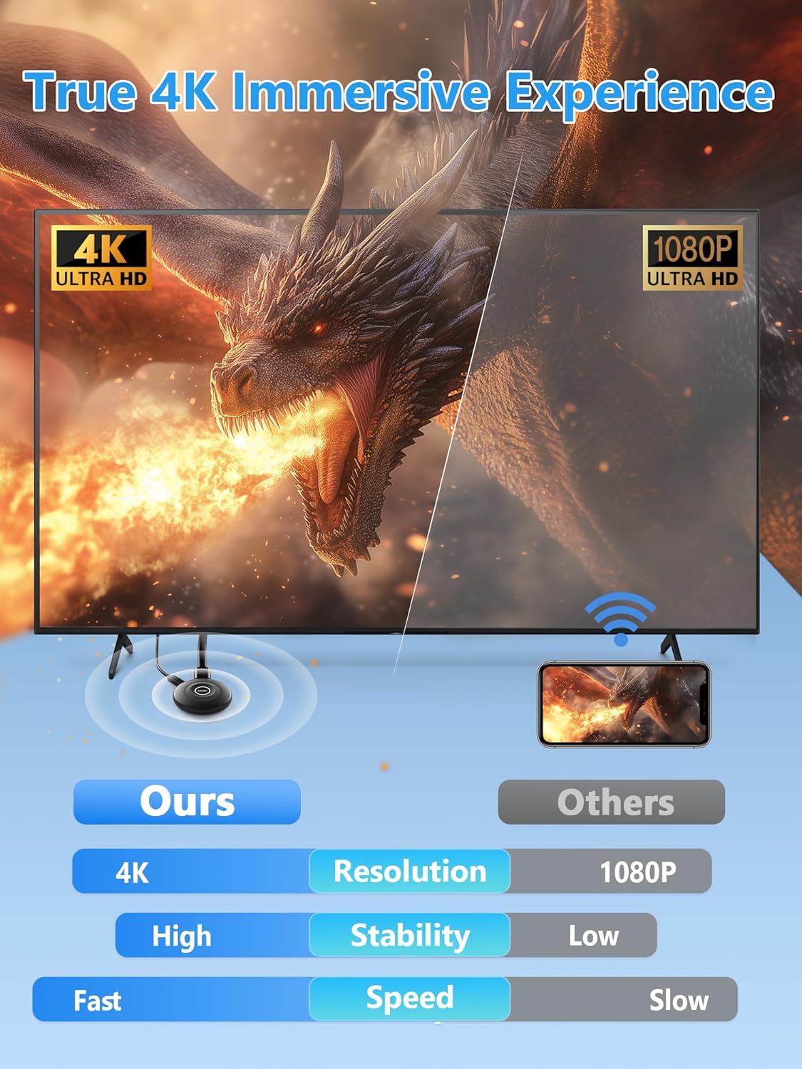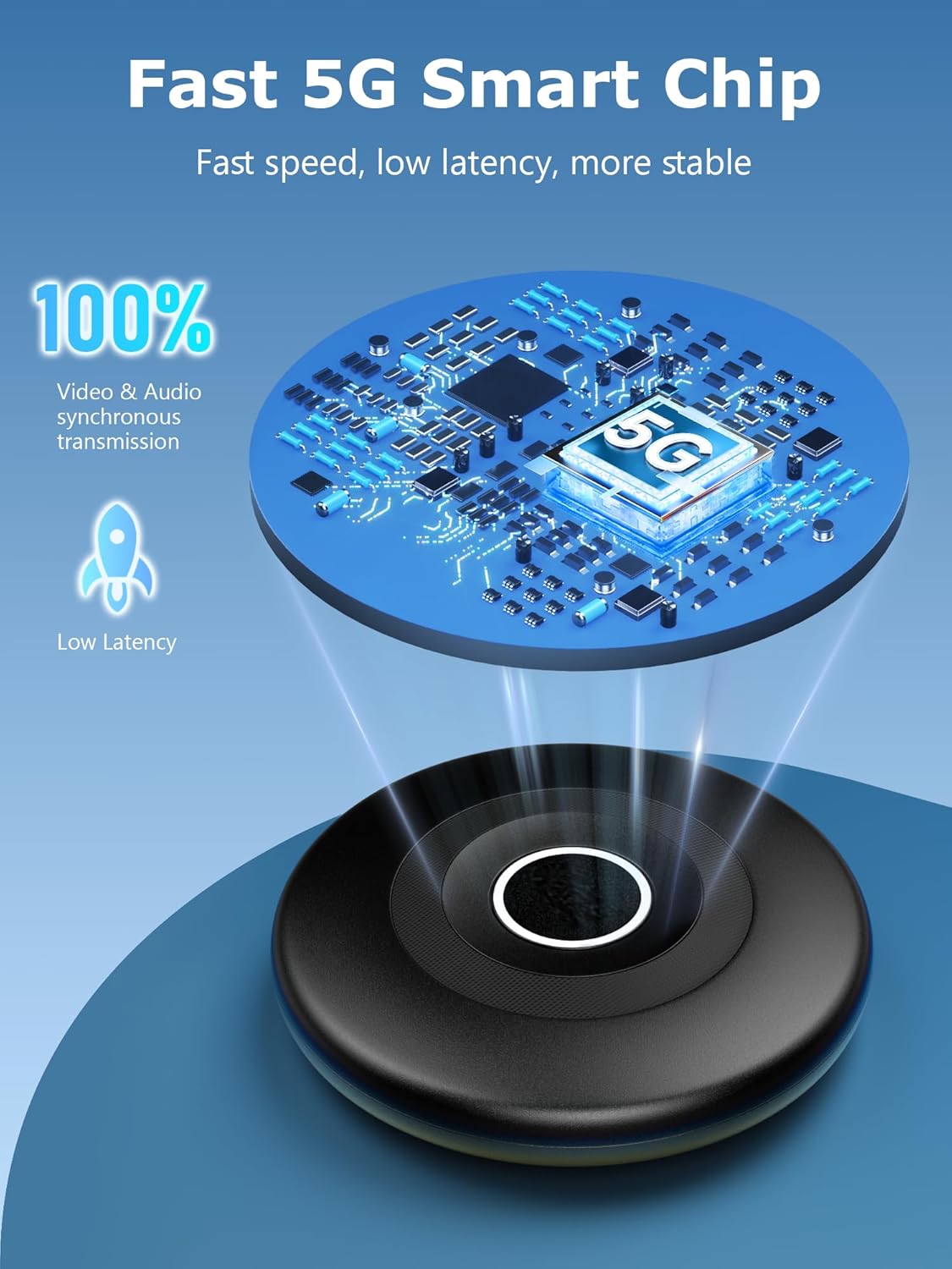 • 【Бърза 5G скорост】Този HDMI безжичен донгъл има вграден 5G чип, който значително подобрява устойчивостта на смущения в сигнала в сравнение с по-старите донгъли с външни антени. Той осигурява постоянно плавно 5G предаване както в мрежови среди с висока плътност, така и в сценарии с множество устройства и позволява беззагубно огледално предаване с ниска латентност.