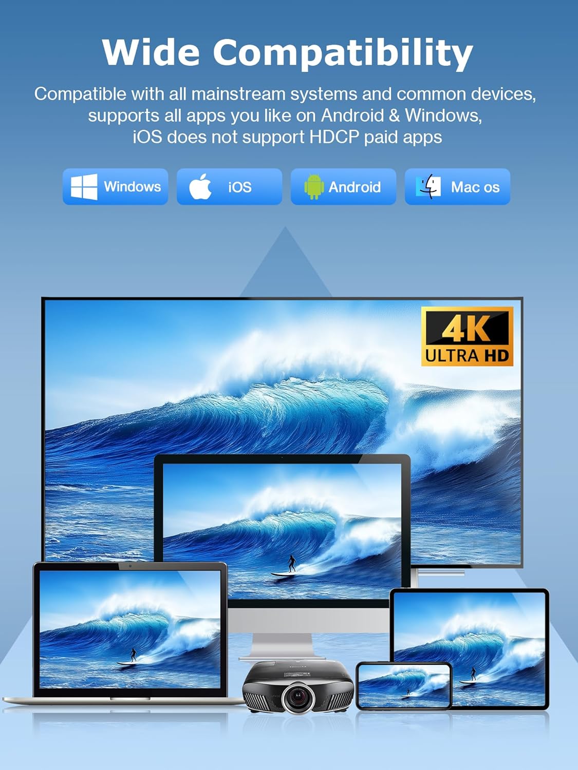 • Универсална съвместимост: Нашият безжичен HDMI WLAN адаптер работи безпроблемно с Android, iOS и Windows компютри и поддържа протоколите AirPlay, Miracast, DLNA и Chromeast. Лесно стриймвайте съдържание от YouTube, TikTok, браузъри или файлове на Microsoft Office. Наслаждавайте се на плавно огледално предаване и кастинг за филми, презентации или многозадачност. Забележка: Приложения с ограничен HDCP, като Netflix, може да не се поддържат.