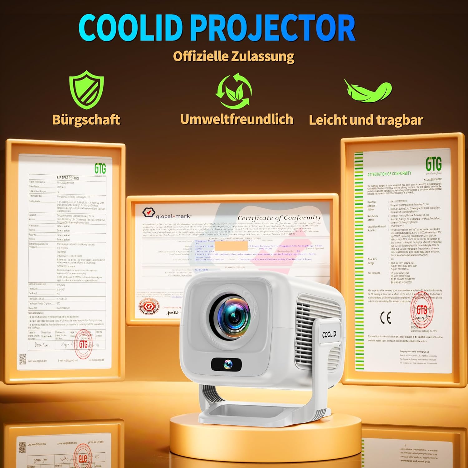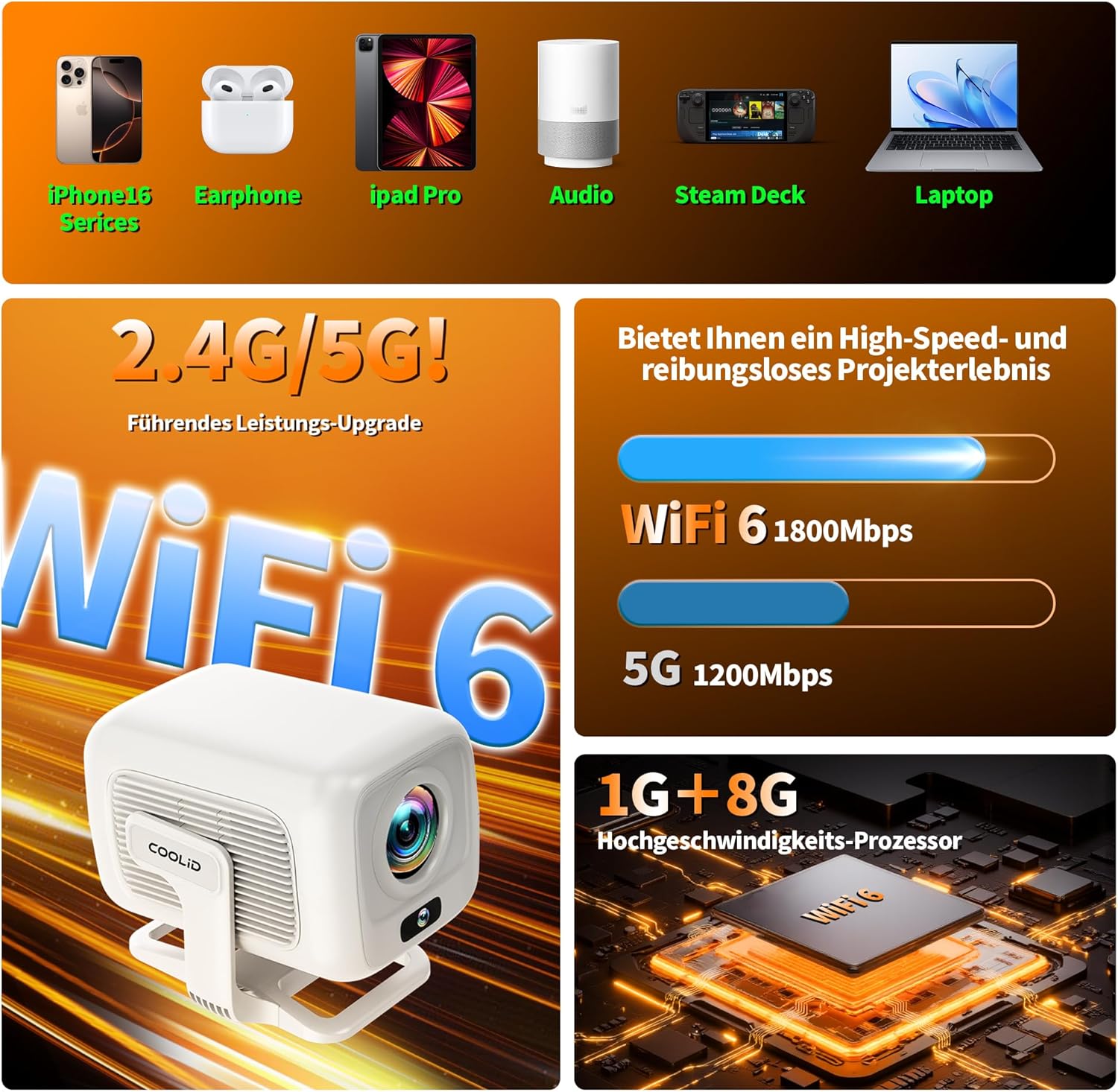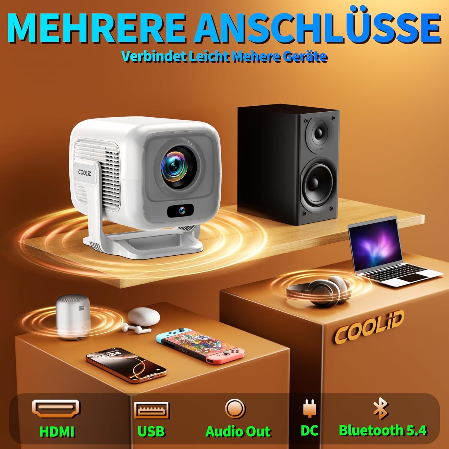 • WiFi 6 и двупосочен Bluetooth 5.4: Мини проекторът Coolid използва двубандова технология Bluetooth 5.4 и WiFi 6 (2.4 GHz и 5 GHz), за да се свързва лесно с множество устройства и да предоставя най-новите актуализации. Благодарение на двупосочното предаване на звук чрез Bluetooth 5.4, можете да свържете слушалки или Bluetooth високоговорители. В режим на заспиване можете да го използвате и като самостоятелна Bluetooth аудио система с вграден 360° съраунд звук и да се насладите на аудио изживяване с кинематографично качество. Насладете се на забавление без прекъсване.