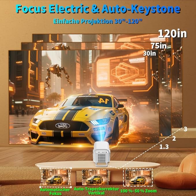 • Автоматично фокусиране и автоматична корекция на трапецовидно изкривяване: този проектор за спалня има автоматично фокусиране и трапецовидна корекция, за да осигури най-ясното и завладяващо зрително изживяване, независимо къде поставяте филма си у дома. Освободете ръцете си: няма нужда да правите ръчни настройки преди всеки поглед. Насладете се на комфортно HD филмово изживяване по всяко време и навсякъде.