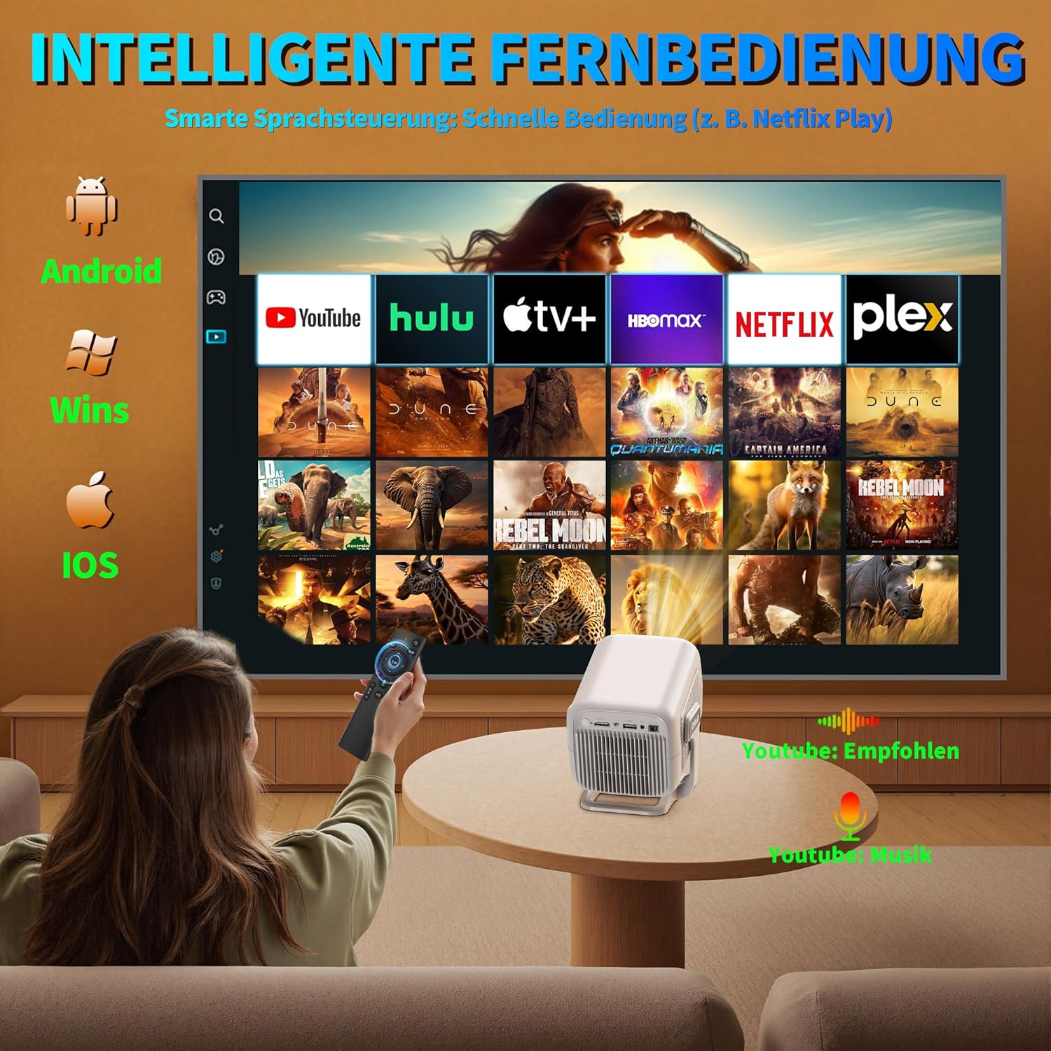 • Двойна система за управление и интегрирано интелигентно приложение за прожектиране: преносимият проектор е оборудван с иновативно интелигентно дистанционно управление с двойна система за управление и функция на мишка, което позволява свободно превключване между режимите на управление. Интегрираната операционна система Android TV позволява лесен достъп до платформи като YouTube, Netflix и Prime Video, без да е необходим TV stick. Насладете се на милиони лесно за ползване и бързо извличане на видео съдържание.