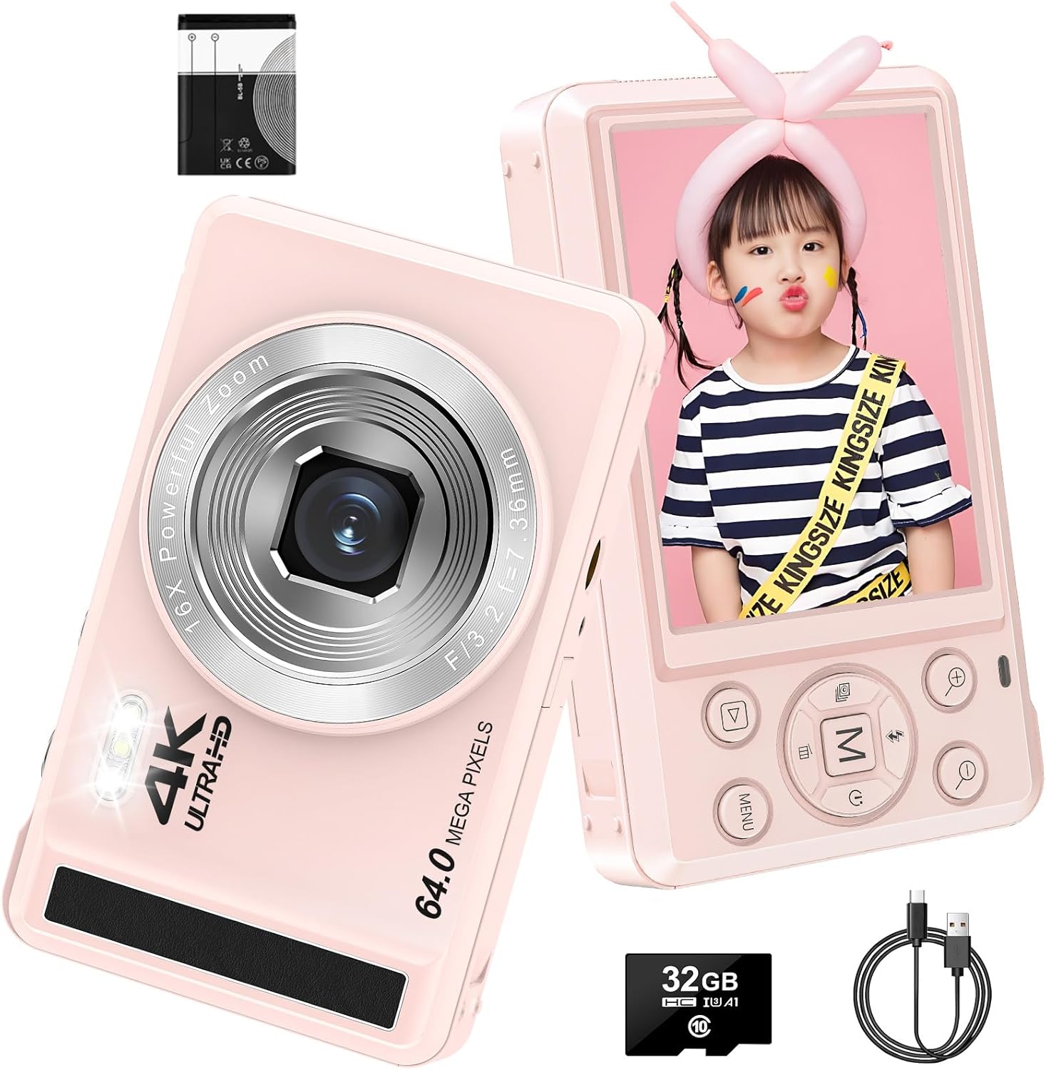 4K цифров фотоапарат, 2.8-инчов 64MP UHD фотокамера с 32GB карта, 1200 mAh батерия, 16x цифрово увеличение, автофокус, компактен фотоапарат за деца, начинаещи, тийнейджъри