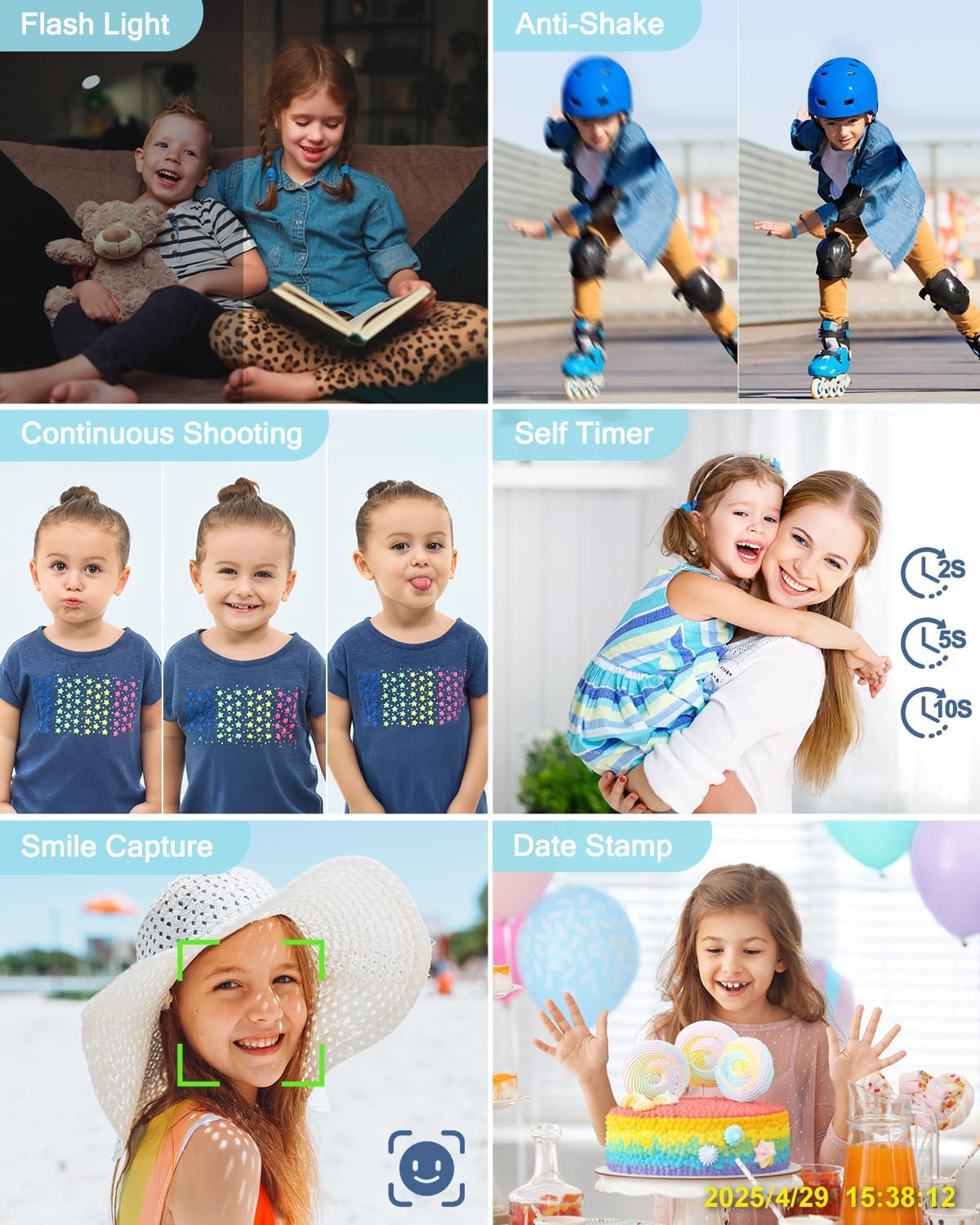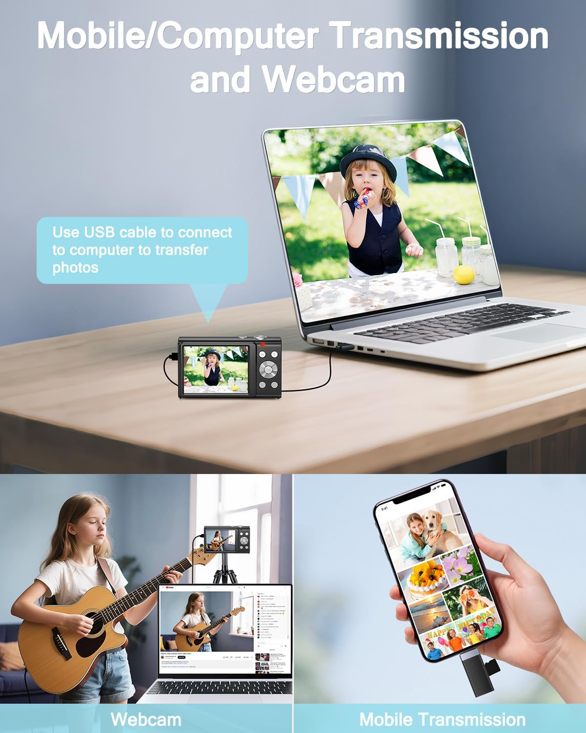 • UHD 4K & 48MP цифров фотоапарат: Този компактен цифров фотоапарат използва най-новата CMOS сензорна система и поддържа 4K видеозапис и снимки с висока резолюция от 48MP. Той може да замести функцията на камерата на мобилния телефон, така че децата да стоят далеч от мобилните телефони, да защитят очите си и да открият красивите моменти от живота.