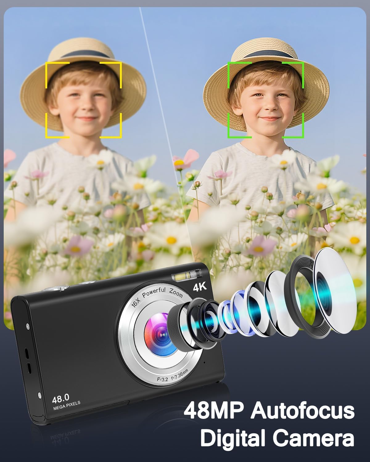 4K цифров фотоапарат 48MP камера с автофокус с 32GB карта, 16X цифрово увеличение, компактен цифров фотоапарат с 2 батерии за начинаещи