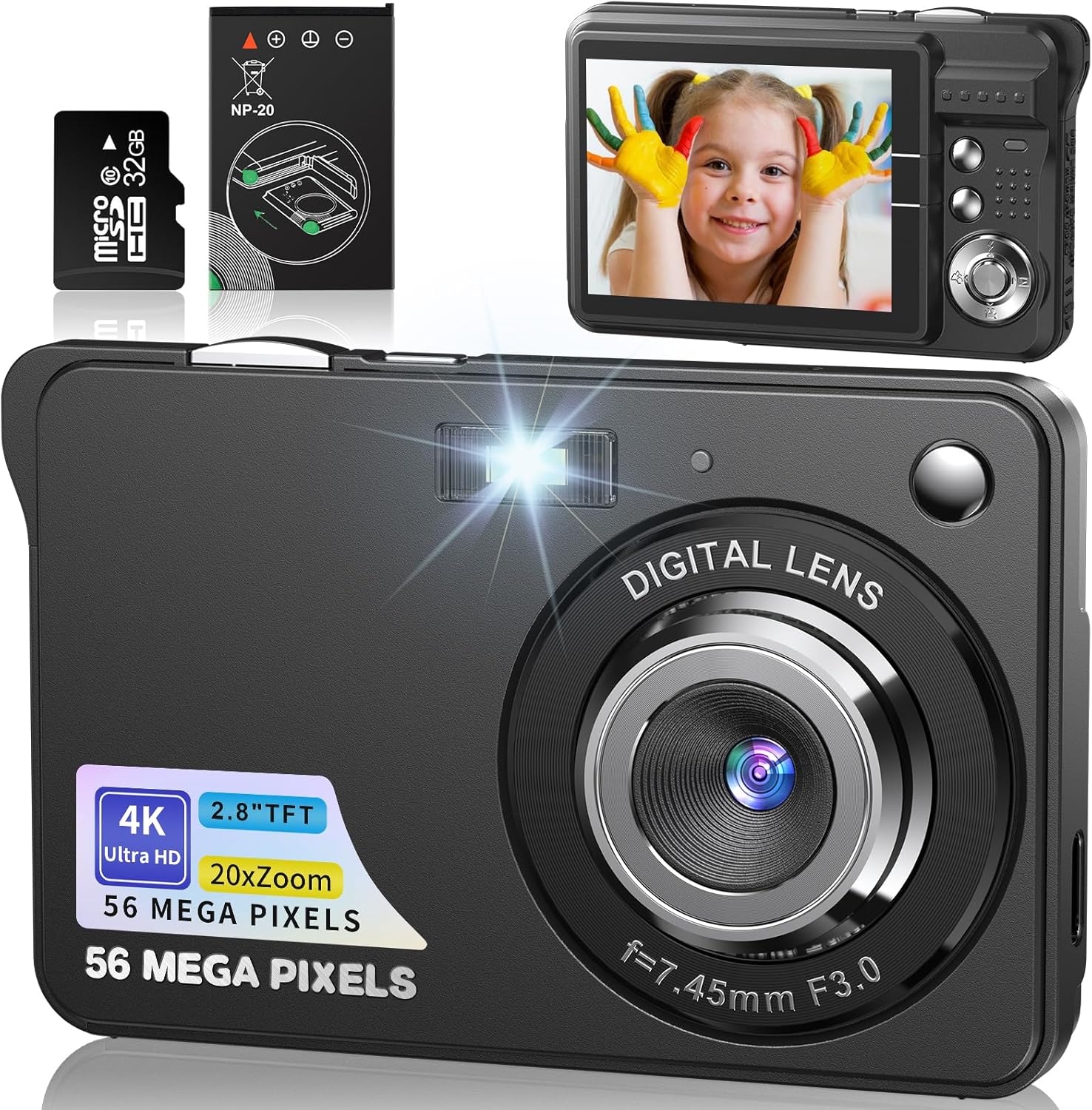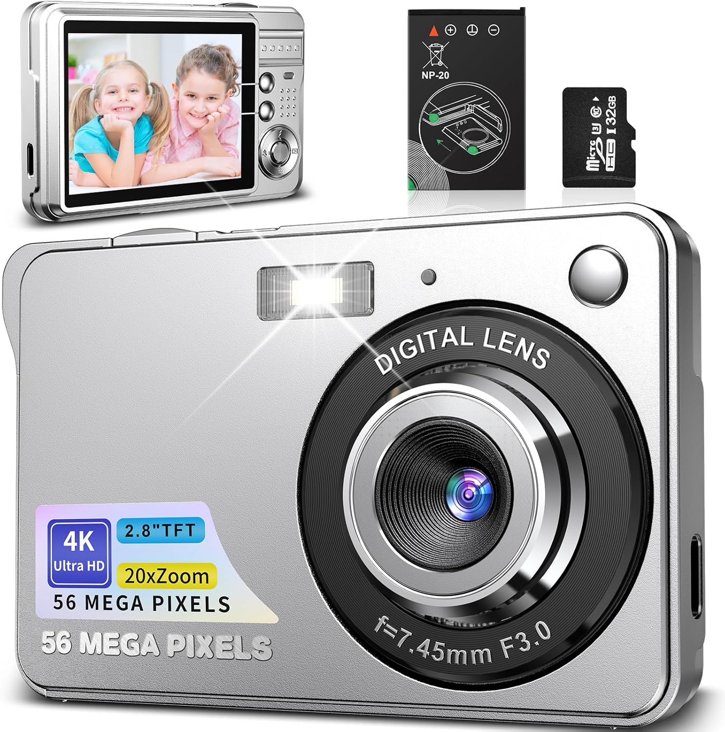 4K цифров фотоапарат 56MP фотокамера с автофокус 20X цифрово увеличение преносима компактна камера с 32GB SD карта за деца, тийнейджъри и начинаещи, подарък (сребрист)
