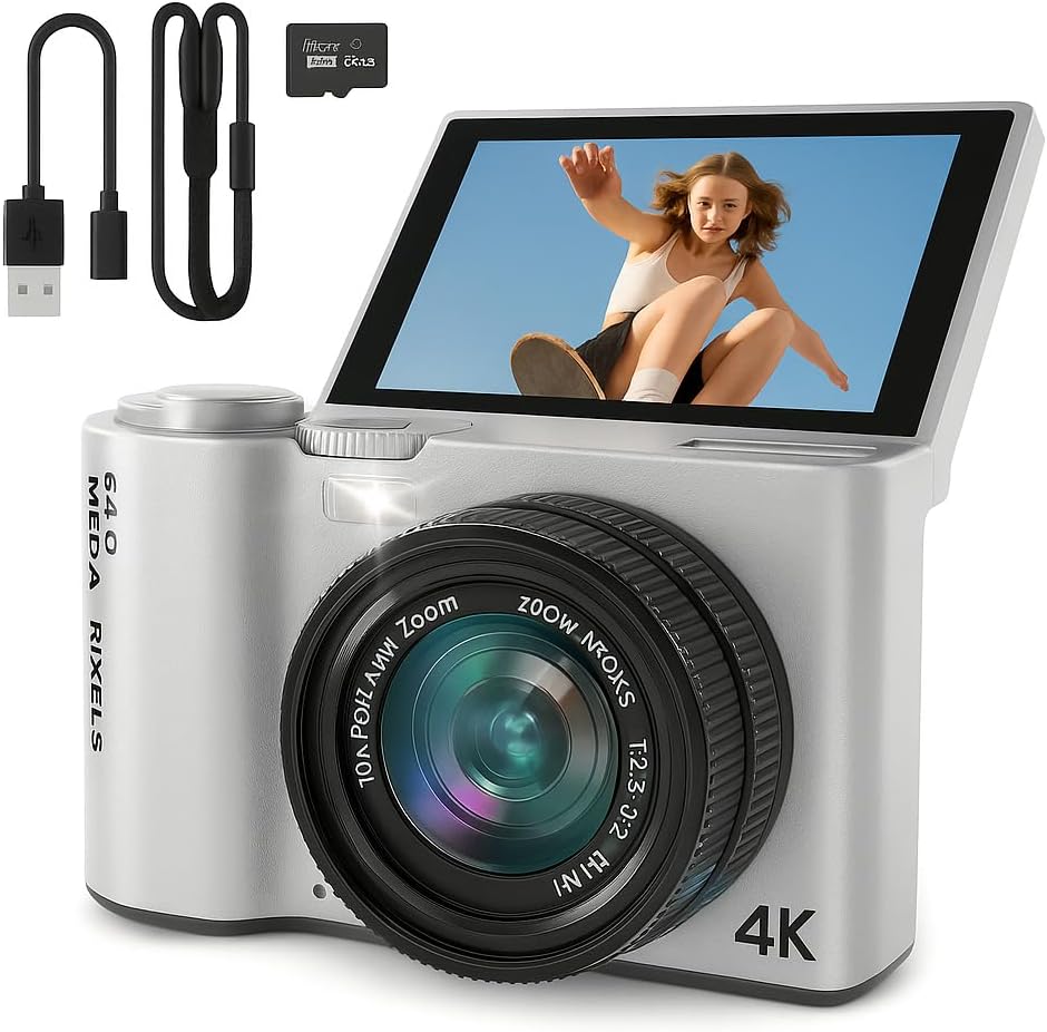 • Battery powered camera and 64GB SD card: the high-capacity battery of beginner cameras for photography frees itself from power constraints.While the built-in battery design of Compact cameras for YouTube video recording does not require frequent battery replacement. Portable video cameras allow inspiration and recording to never stop. Digital camera that syncs to phone to handle all day shooting tasks.White digital cameras for photography capture the excitement of life at any time.