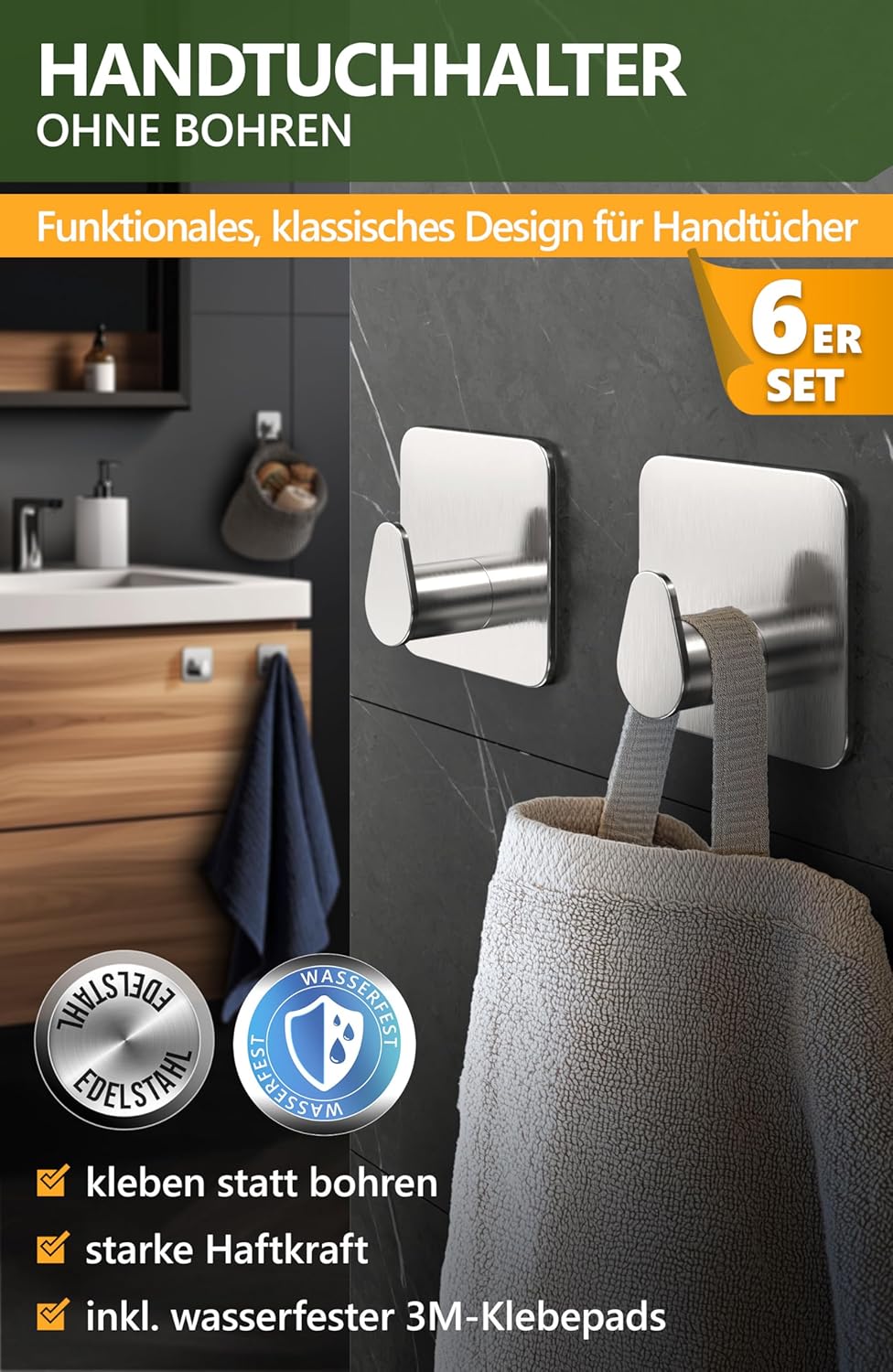 4smile Комплект от 6 сребърни държача за кърпи за баня, без пробиване, функционални овални самозалепващи кукички от неръждаема стомана, водоустойчиви кукички за баня, самозалепващи кукички за кърпи