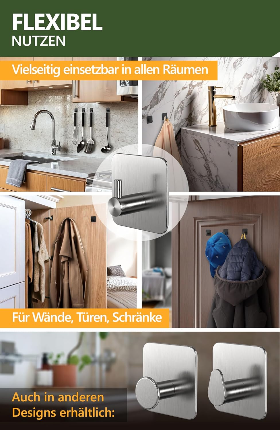 • Гъвкава употреба – пакет от 6 самозалепващи се кукички в черно, задължителен за първия апартамент; Универсална употреба върху врати, шкафове, стени или като държач за кърпи в кухнята, самозалепващи се кукички за баня или самозалепващи се кукички за палта в хола.