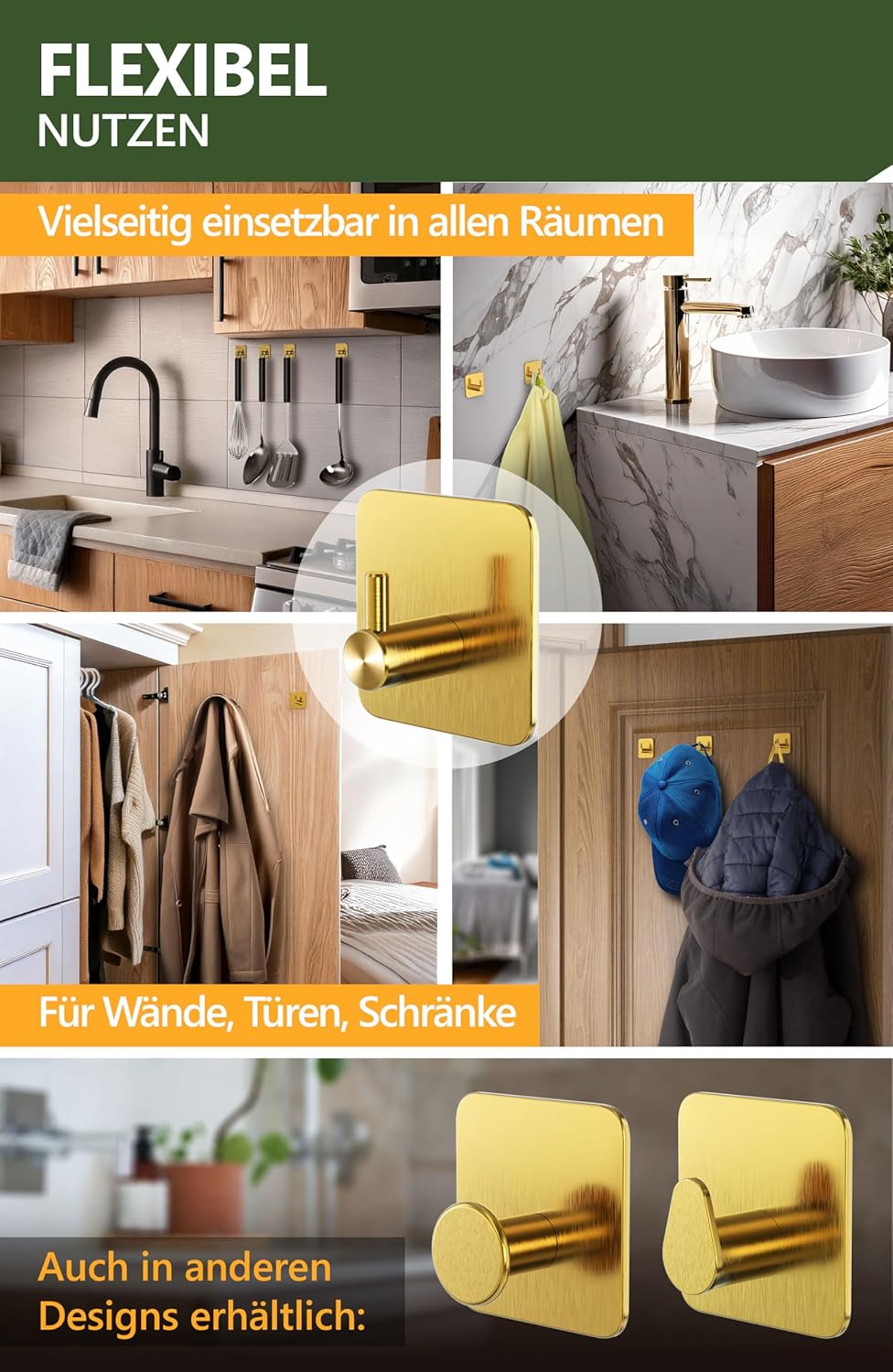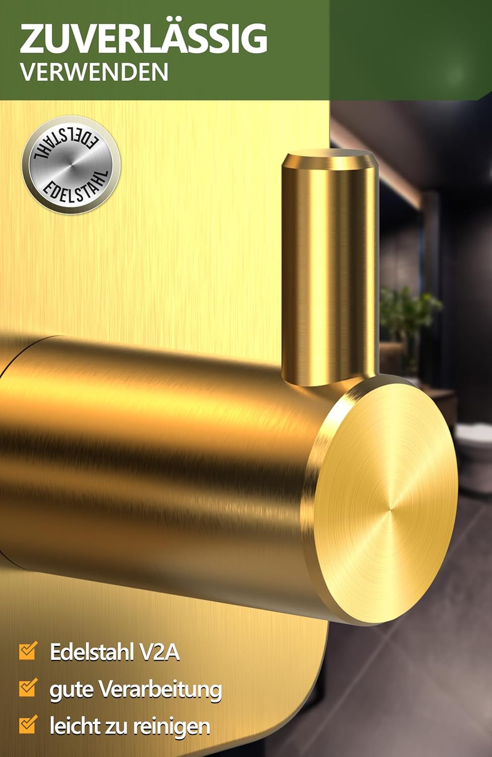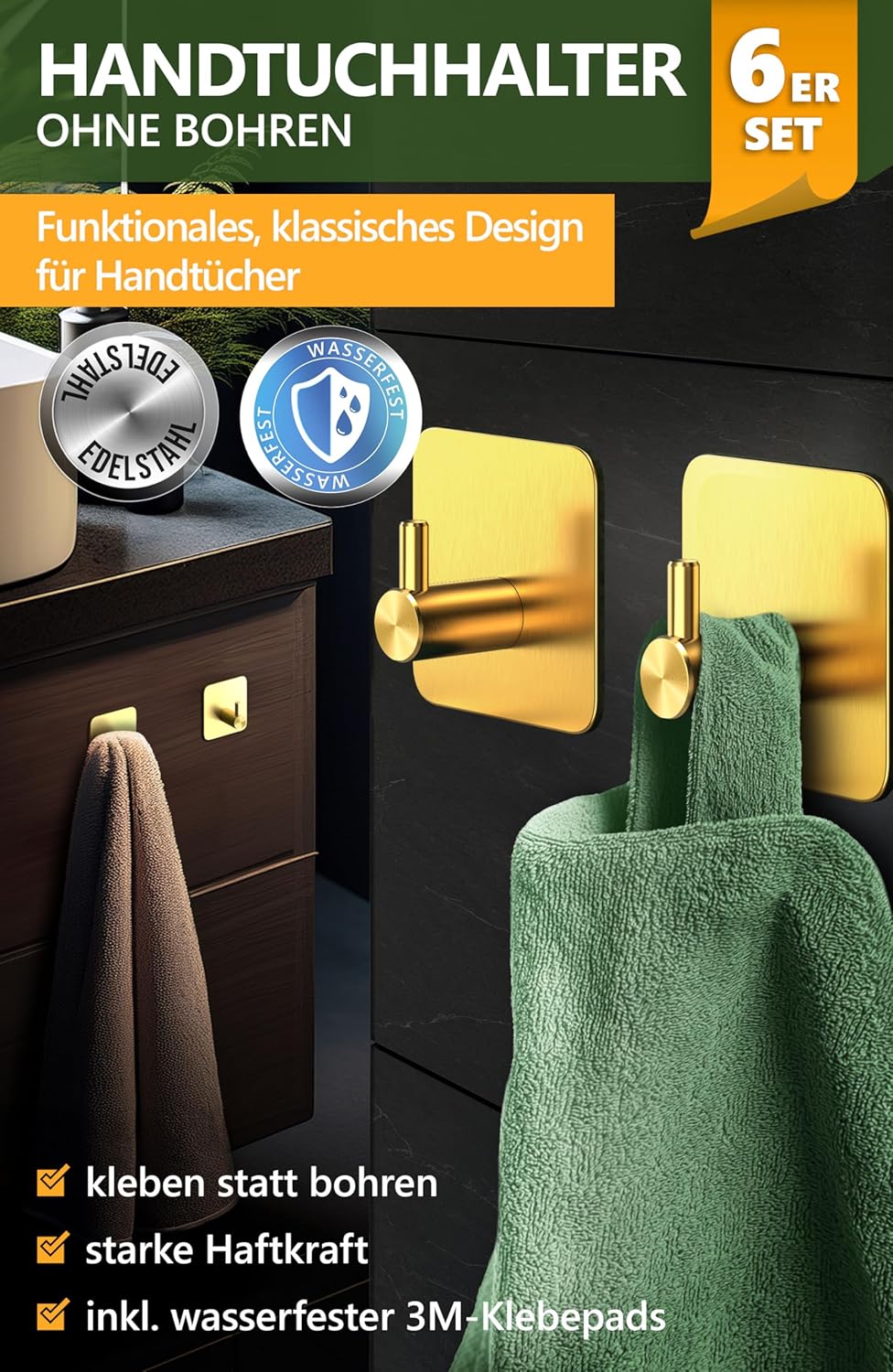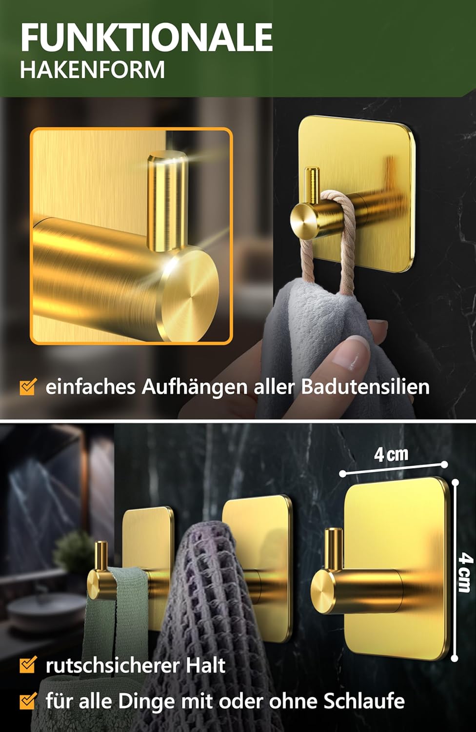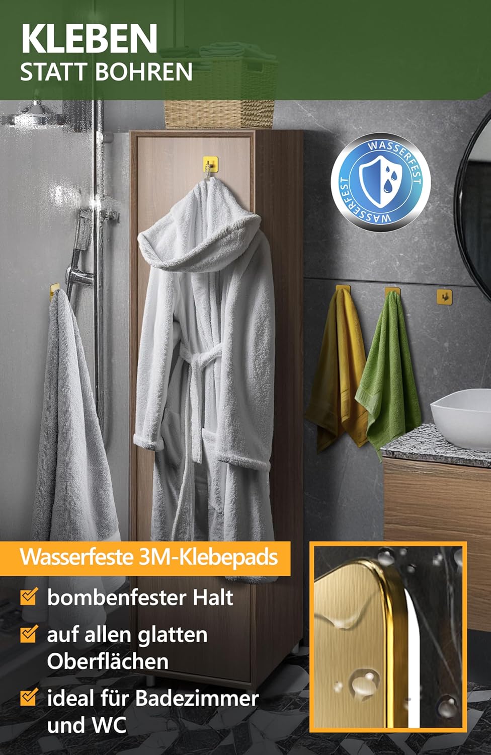 4smile Комплект от 6 златни държача за кърпи за баня, без пробиване, функционални самозалепващи куки от неръждаема стомана, висока товароносимост, водоустойчиви куки за баня, самозалепващи куки за кърпи