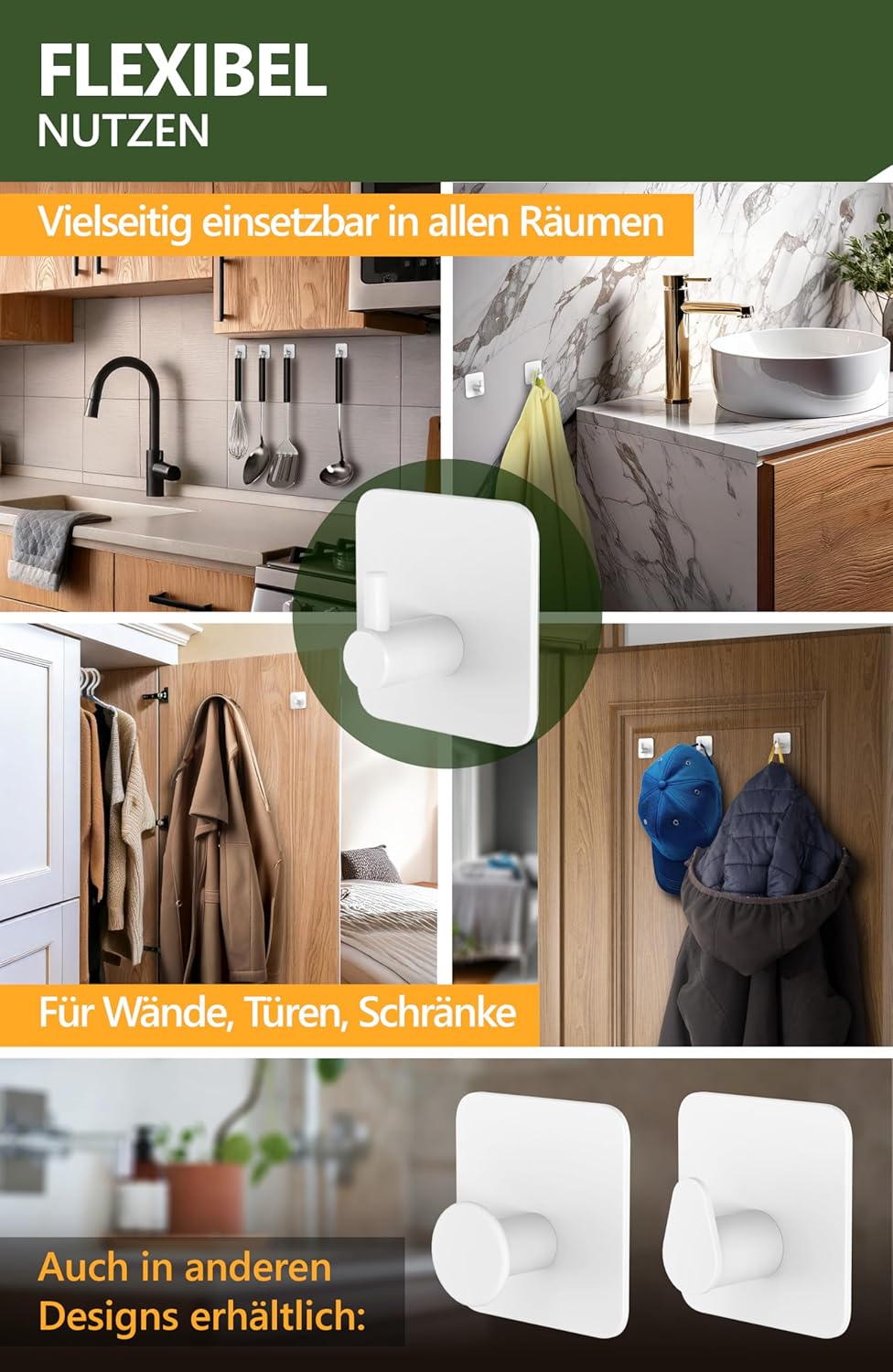 • Гъвкава употреба – пакет от 6 самозалепващи се кукички в черно, задължителен за първия апартамент; Универсална употреба върху врати, шкафове, стени или като държач за кърпи в кухнята, самозалепващи се кукички за баня или самозалепващи се кукички за палта в хола.