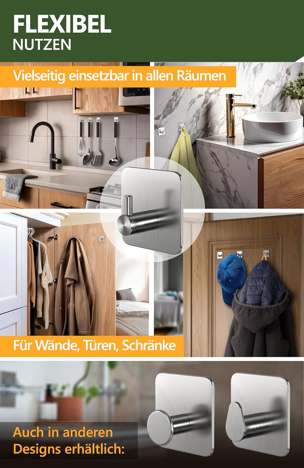 • Гъвкава употреба – пакет от 6 самозалепващи се кукички в черно, задължителен за първия апартамент; Универсална употреба върху врати, шкафове, стени или като държач за кърпи в кухнята, самозалепващи се кукички за баня или самозалепващи се кукички за палта в хола.