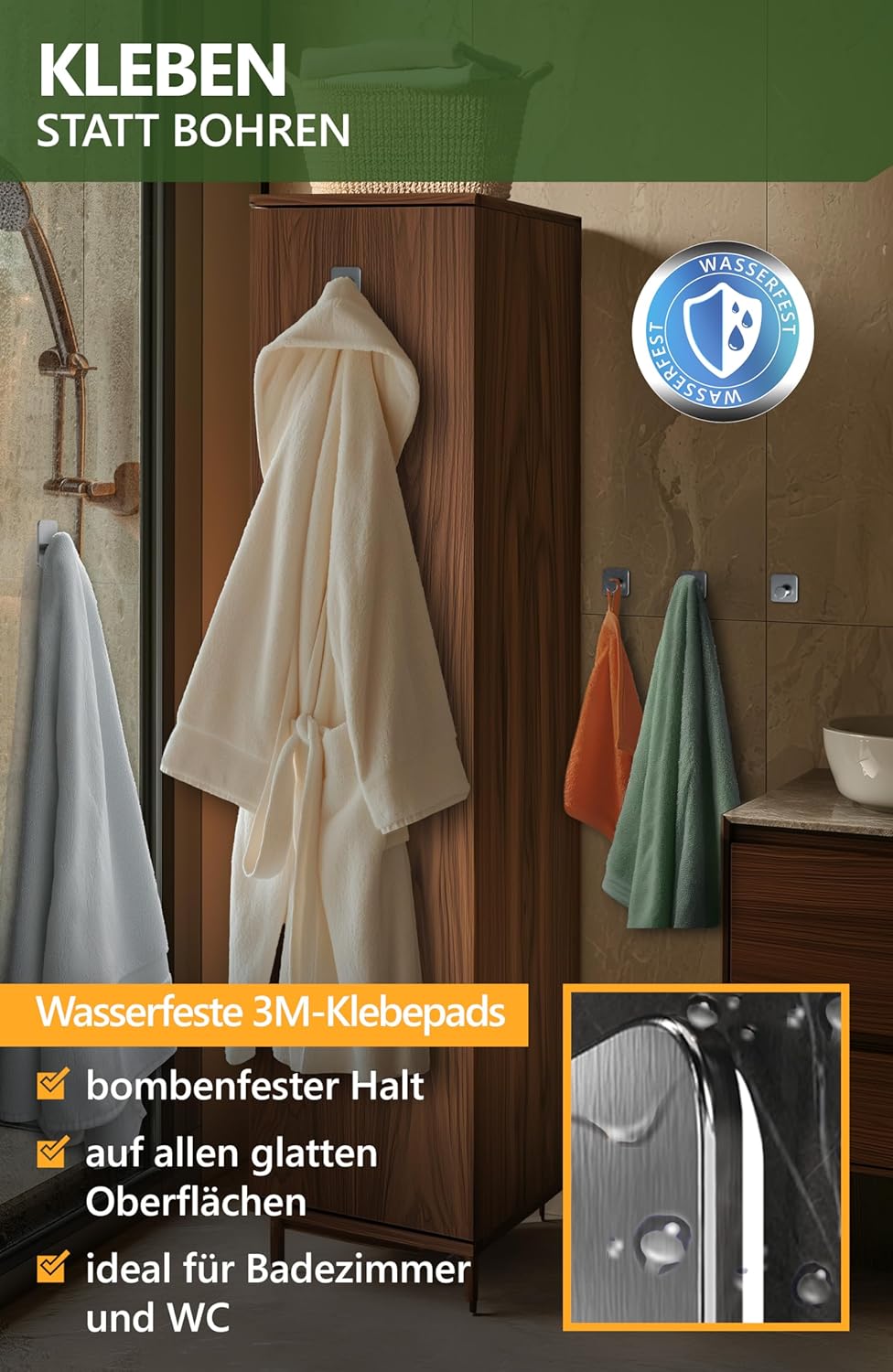 • Лепене вместо пробиване – здравите куки без пробиване с водоустойчиви 3M лепящи подложки гарантират сигурно задържане до 10 кг върху всички гладки повърхности, дори когато са мокри. Идеални като самозалепваща се кука за кърпи в банята и тоалетната.