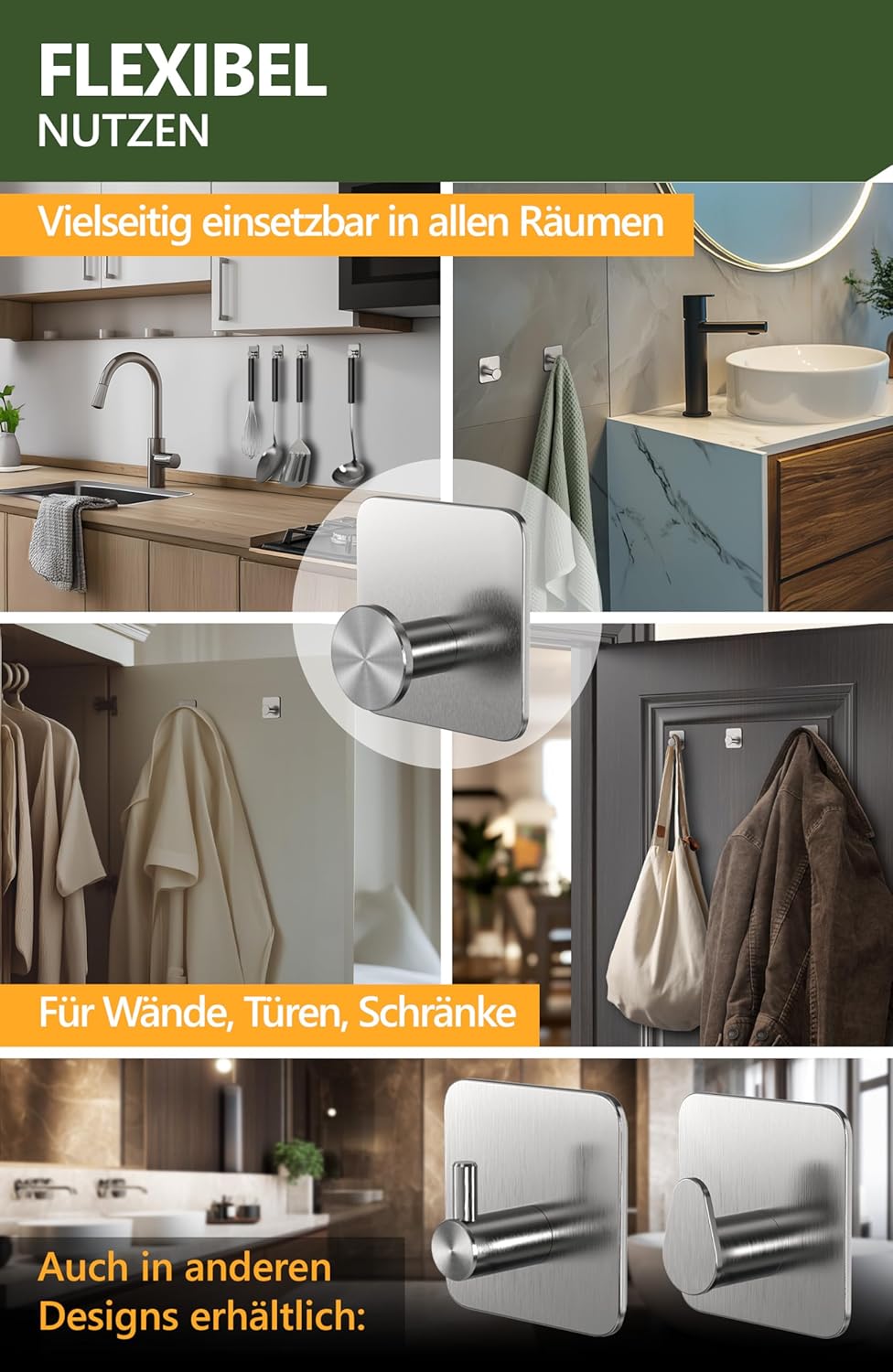• Гъвкава употреба – пакет от 6 самозалепващи се кукички в черно, задължителен за първия апартамент; Универсална употреба върху врати, шкафове, стени или като държач за кърпи в кухнята, самозалепващи се кукички за баня или самозалепващи се кукички за палта в хола.