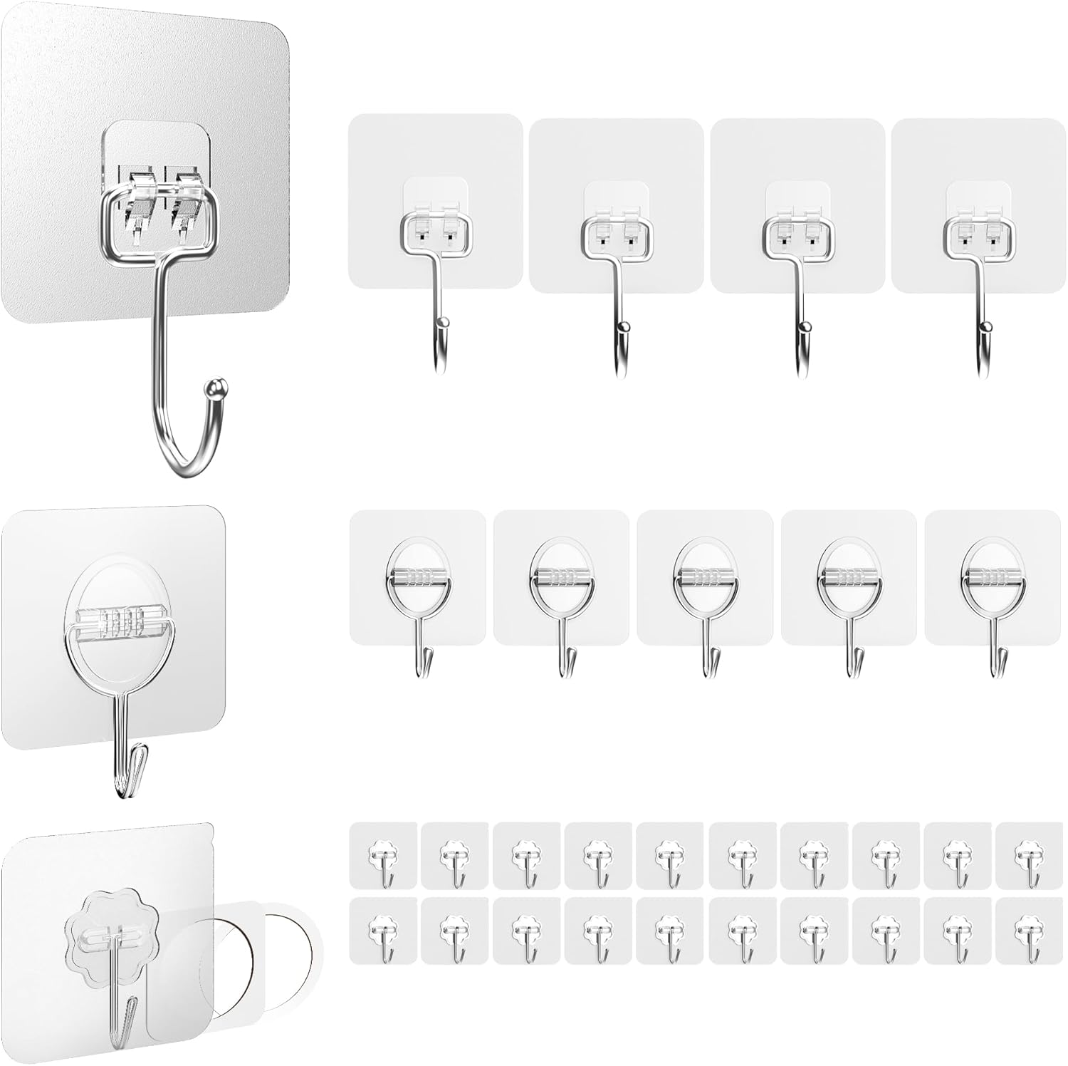 • Пакет от 30 прозрачни самозалепващи куки - Незабележимите самозалепващи стенни куки са изключително здрави и водоустойчиви; подходящи за употреба на закрито, като баня, кухня, хол и спалня, но също така идеални за употреба на открито.