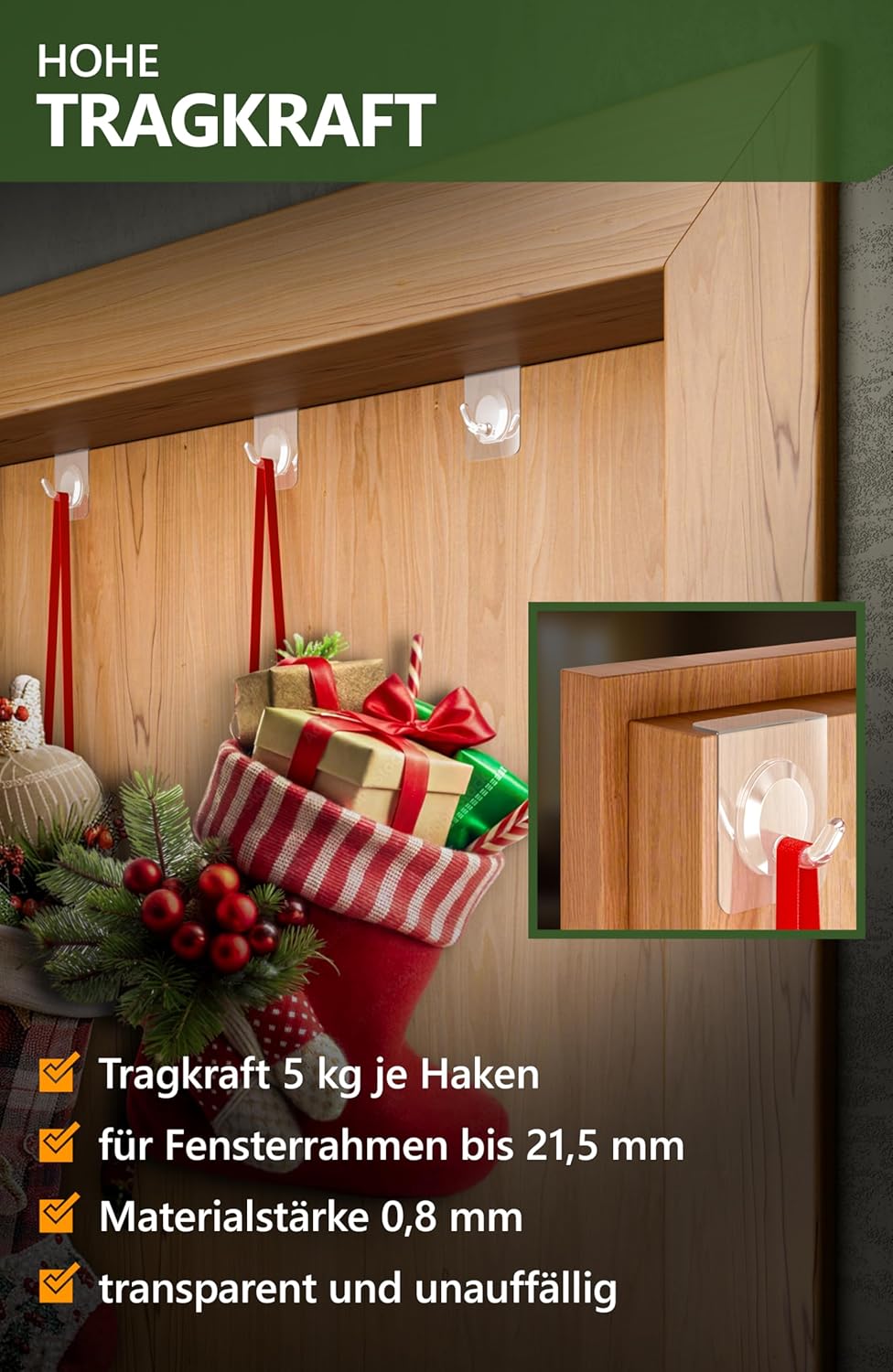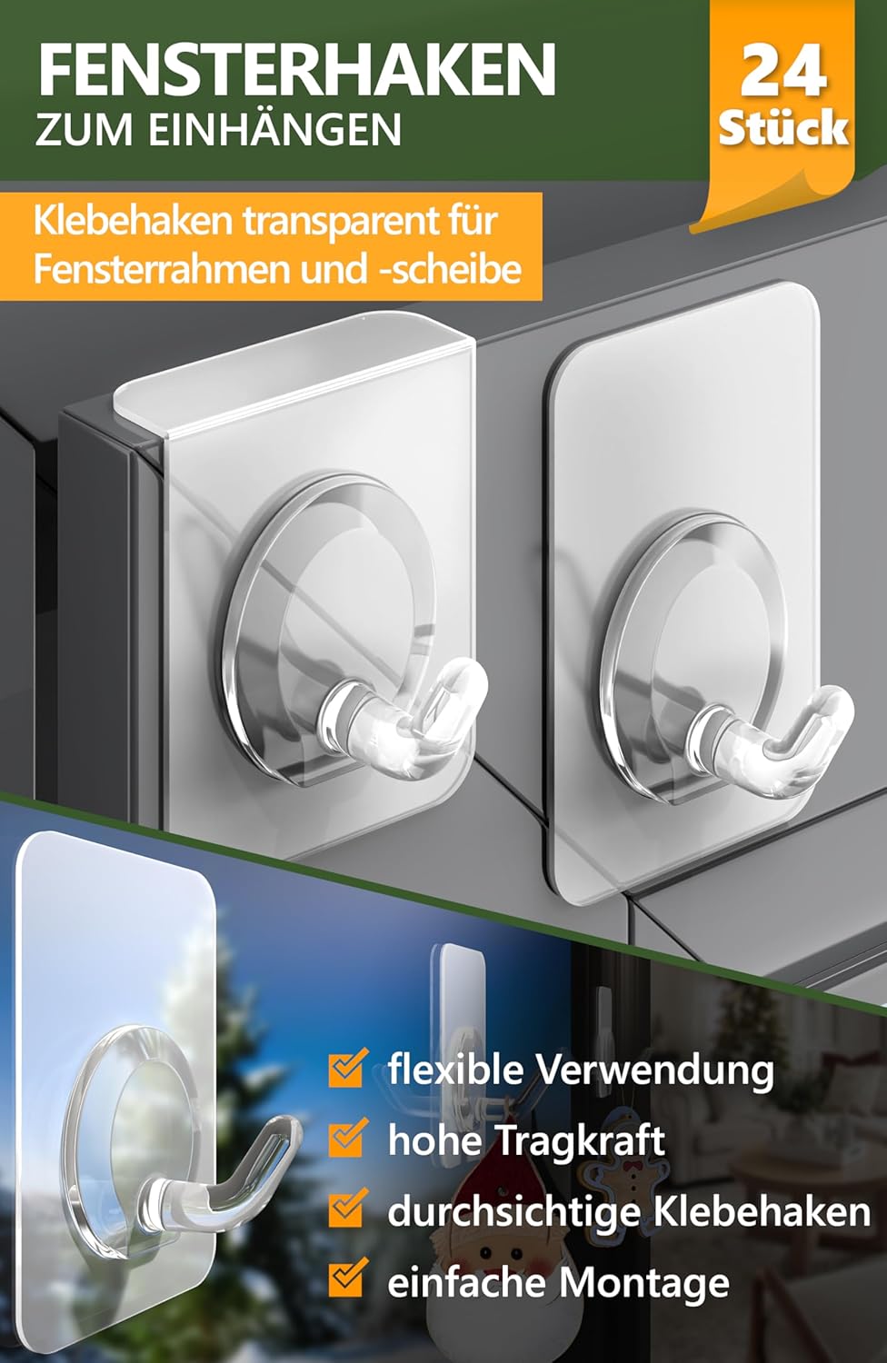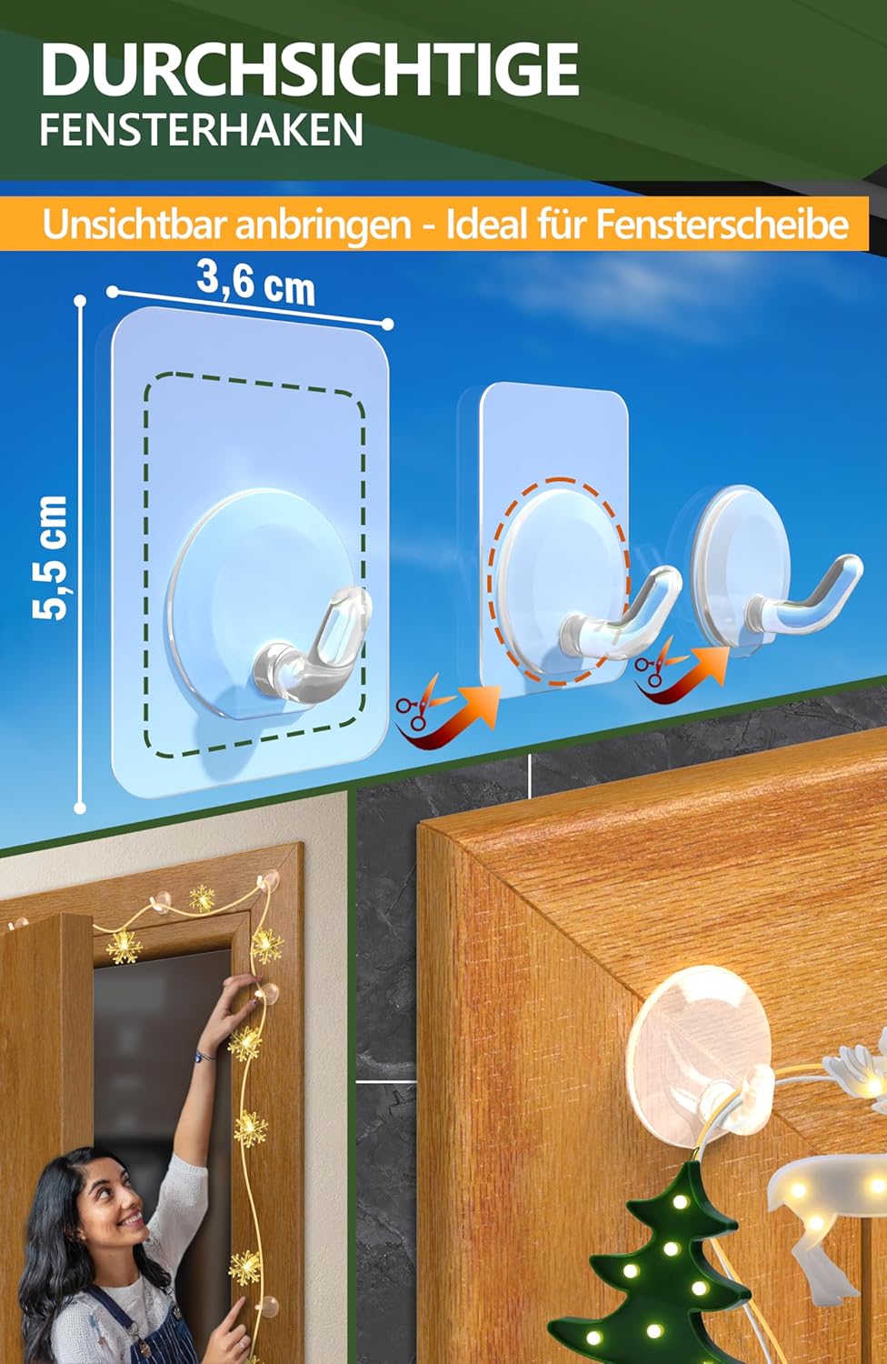 • НЕВИДИМ МОНТАЖ - Прозрачни самозалепващи се куки. Незабележимите куки за таван и стена са добро решение за окачване на коледни украси и други декоративни предмети в дома.