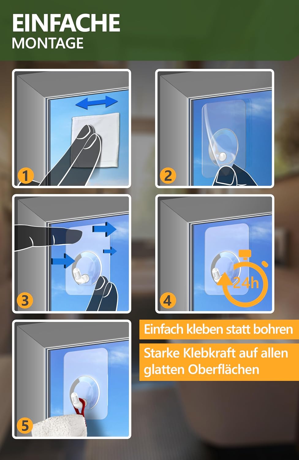 • Лесен монтаж - Силна адхезия върху всички гладки повърхности. За монтаж, почистете повърхността, залепете на куката, изчакайте 24 часа, след което натоварете с до 5 кг. Отстраняване без следи чрез нагряване със сешоар.