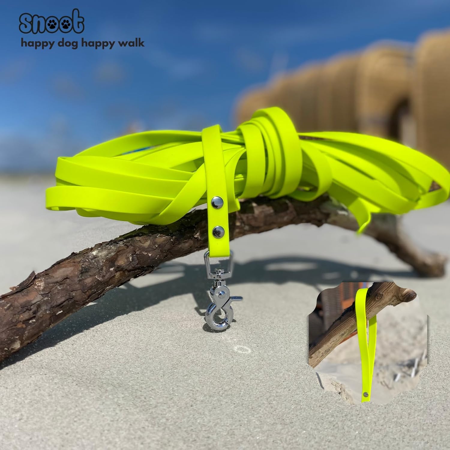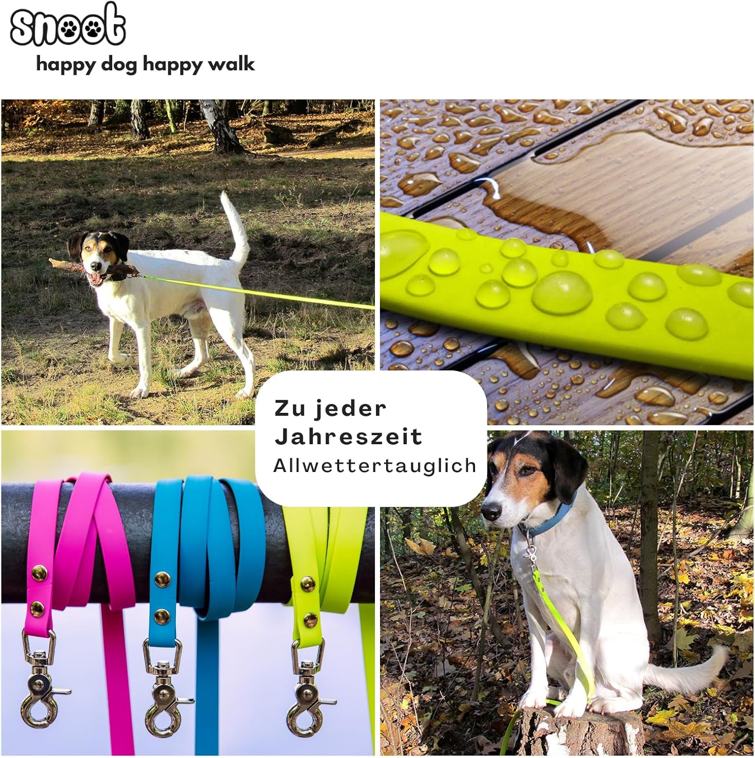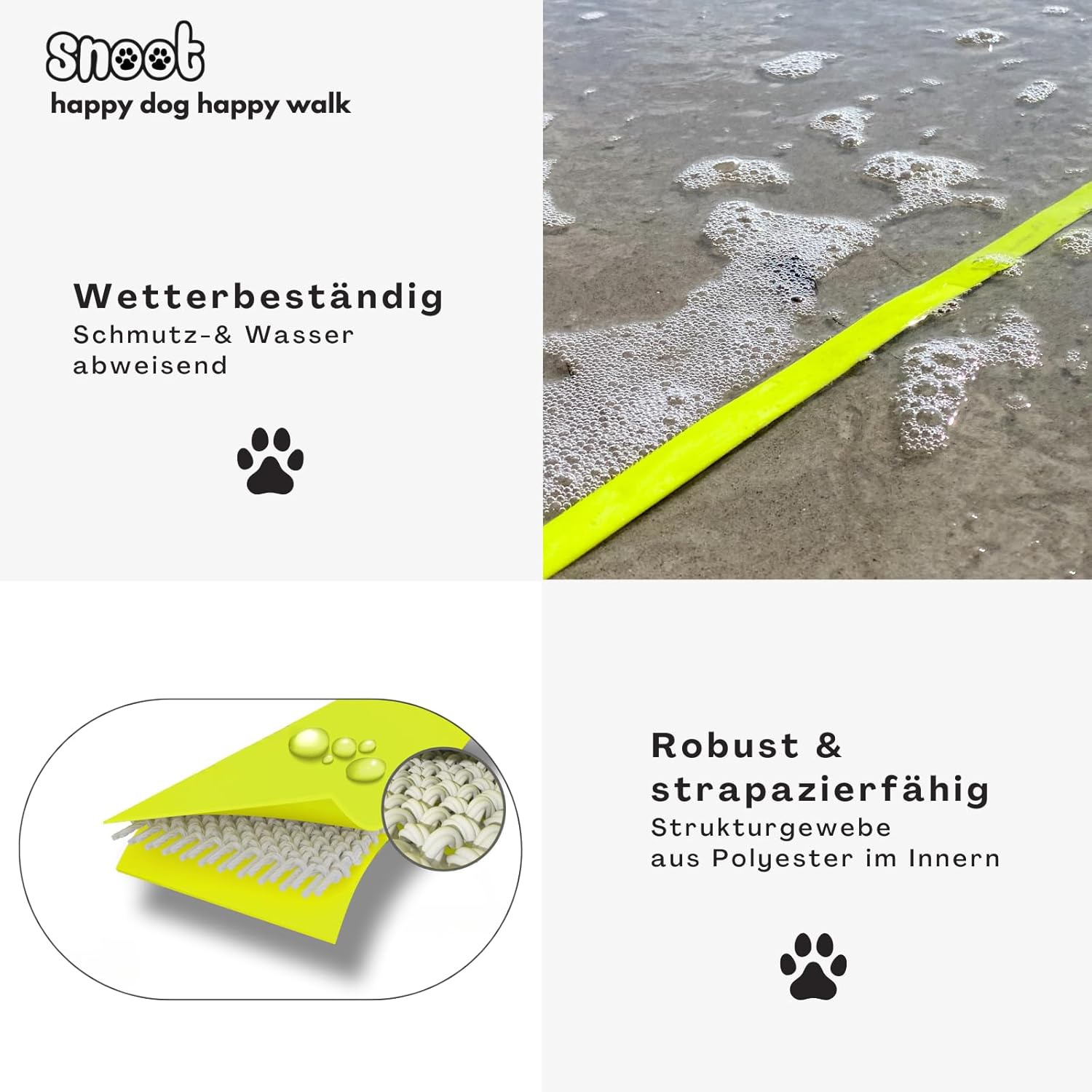 Нашите поводи за кучета SNOOT са изработени от издръжлива полиестерна материя, покрита с устойчив на атмосферни влияния термопластичен полиуретан (TPU). Така че е водоустойчива и не се самоабсорбира.