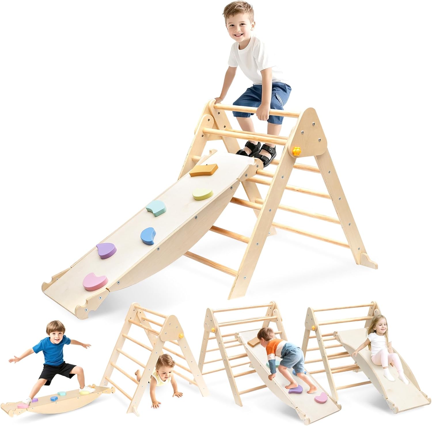 5-в-1 детска катерушка Монтесори с пързалка за вътрешна употреба, комплект дървена катерушка със сгъваема триъгълна стълба