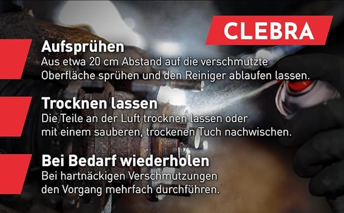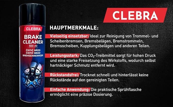 CLEBRA Почистващ препарат за спирачки 500 мл със силен разтварящ ефект. CO2 пропелентът осигурява по-силно снабдяване с активни съставки. Антикорозионно средство. Без ацетон. Използвайте при стайна температура. Разклатете преди употреба. Напръскайте замърсените части и оставете активната съставка да се отцеди. Избършете чистите части с чиста, суха кърпа. Повторете процеса в случай на силно замърсяване. Датата на производство е посочена на опаковката. Обхват на приложение: за почистване и обезмасляване на части като спирачки (барабани и дискови спирачки, накладки, спирачни накладки, цилиндри, пружини и втулки), съединители (накладки и компоненти на съединителя), компоненти на двигателя (карбуратори, бензинови и маслени помпи, трансмисии и др.) и други места, където е необходимо отстраняване на замърсявания, мазнини и отломки. Съхранение: Съхранявайте в оригинални запечатани опаковки, защитени от атмосферни влияния, при температура от 5 до 45 °C. Гаранционният срок е 36 месеца от датата на производство, посочена на опаковката.