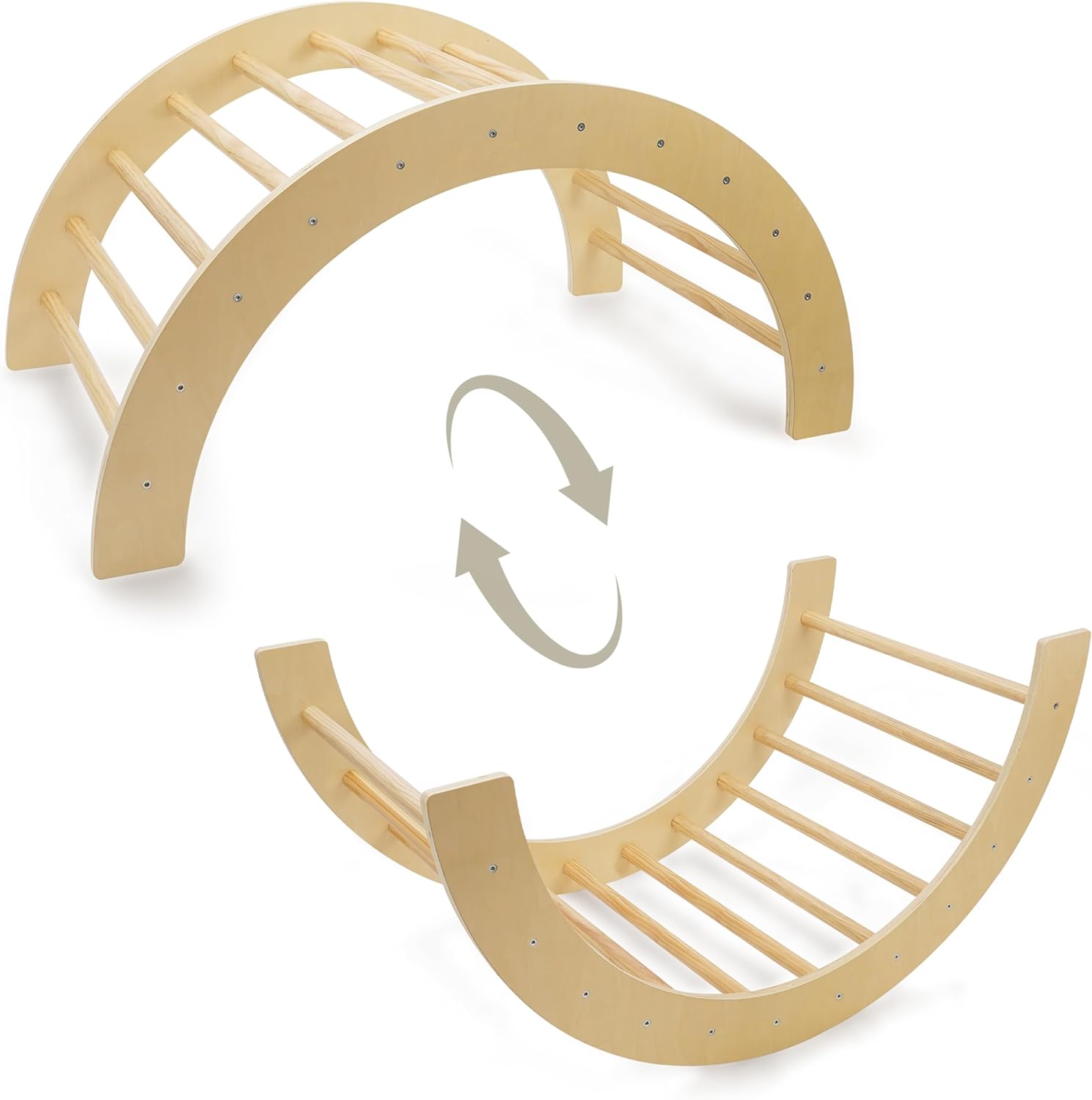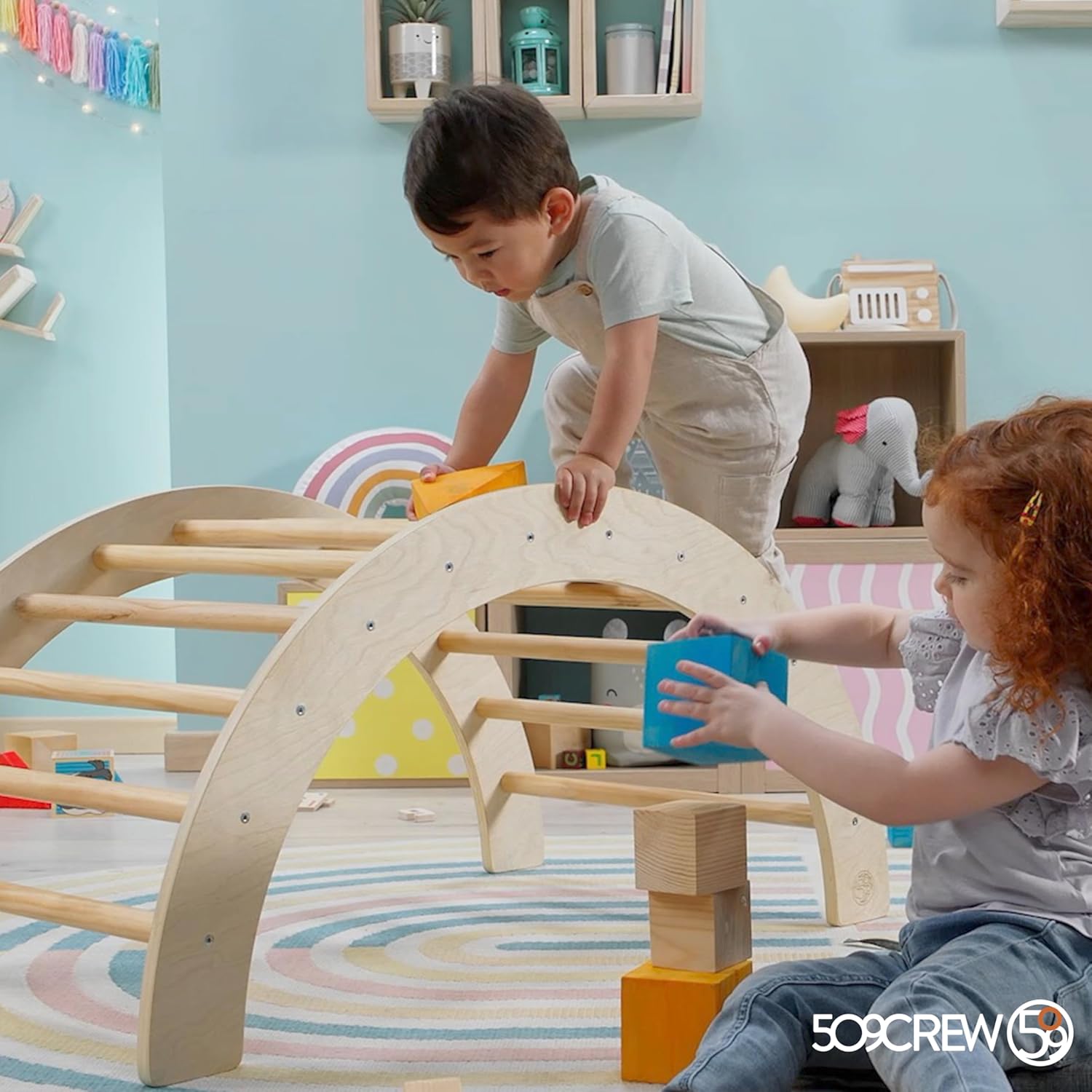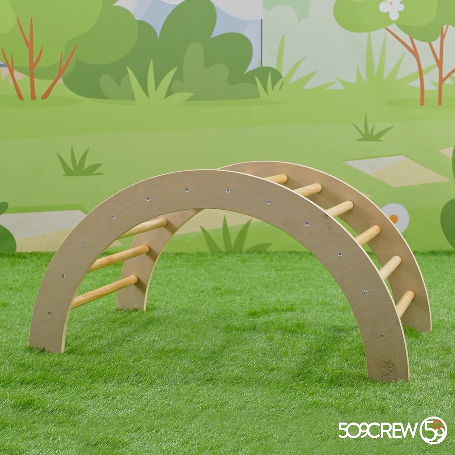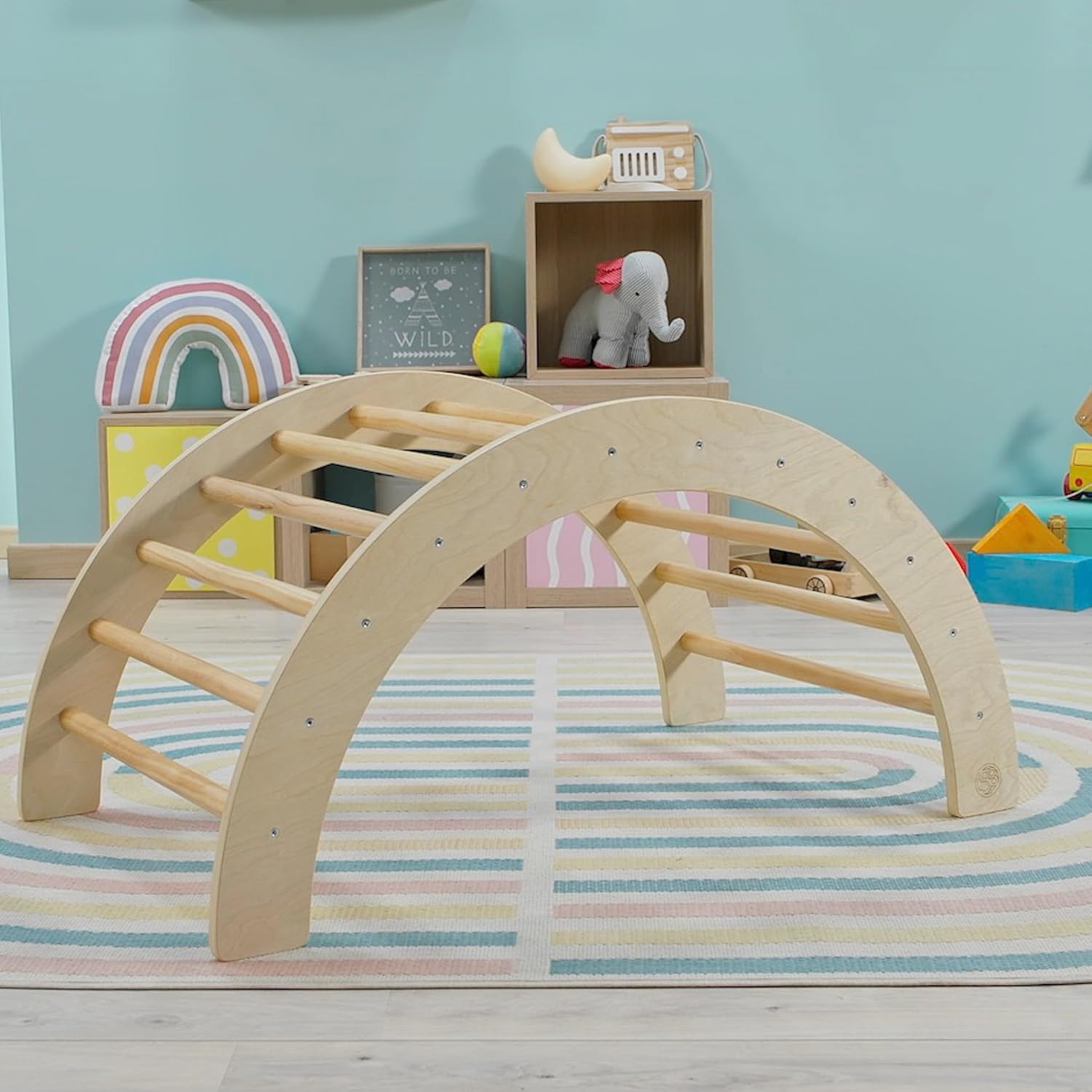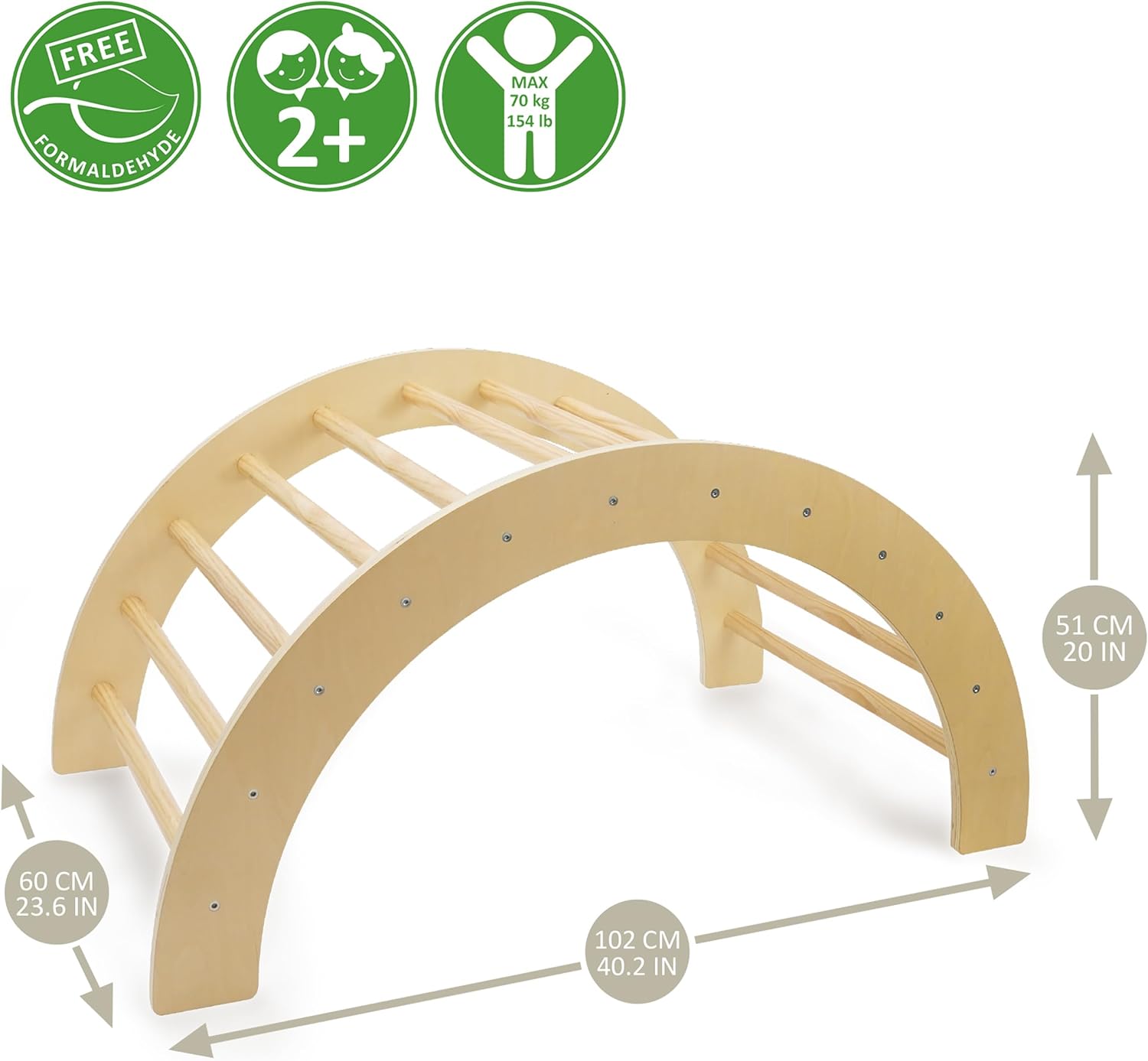 Арката за катерене 509 JUNGLE 2 в 1 насърчава двигателните умения, баланса и координацията между ръцете и краката на децата, предлагайки възможности за творческа игра като тунел, пещера, люлка или люлееща се лодка. Изработена от висококачествен, тестван без формалдехид шперплат, тя издържа до 70 кг и отговаря на стандарта EN71 за деца на възраст 24 месеца и нагоре. Арката е лесна за сглобяване с помощта на включения шестостенен ключ и инструкции, а размерите ѝ са 102 × 60 × 51 см.