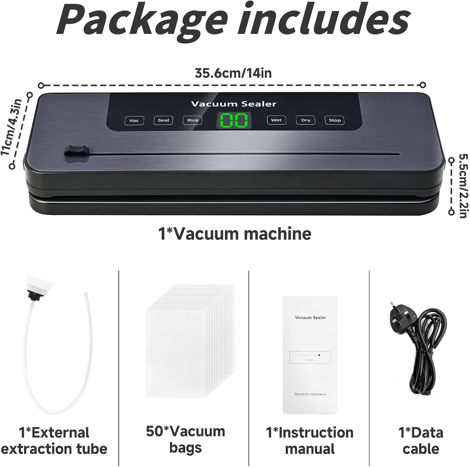 • Комплект за начинаещи. Пакетът включва 1 машина за вакуумиране, 50 вакуумни торбички, 1 захранващ кабел, външен маркуч (за вакуумиране на специални контейнери и бутилки) и 1 ръководство за потребителя. Пълен комплект за максимална свежест и удобство.