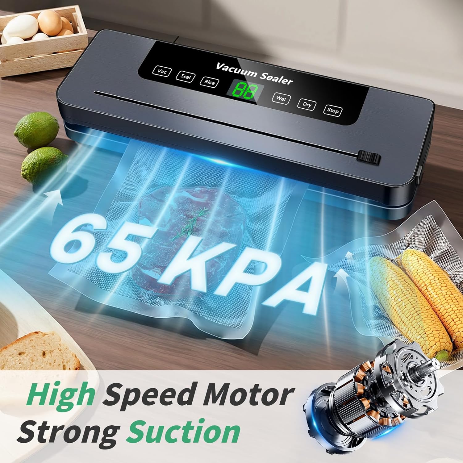 • Запазване на свежестта и бърза обработка. Вакуумната машина използва усъвършенствана технология за запечатване, за да удължи свежестта на храната с 6 до 8 пъти. Тя предотвратява загубата на влага и запазва хранителните вещества, за да можете да се наслаждавате на по-здравословни ястия. Идеална за съхранение на храна у дома, в ресторанти или при къмпинг и пътуване.
