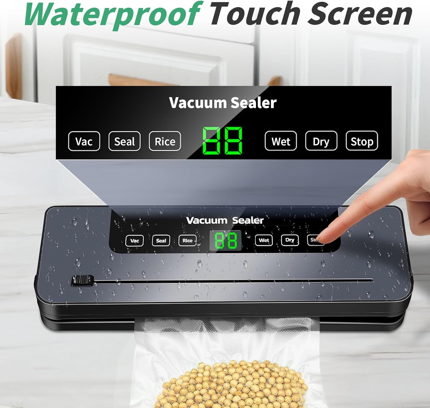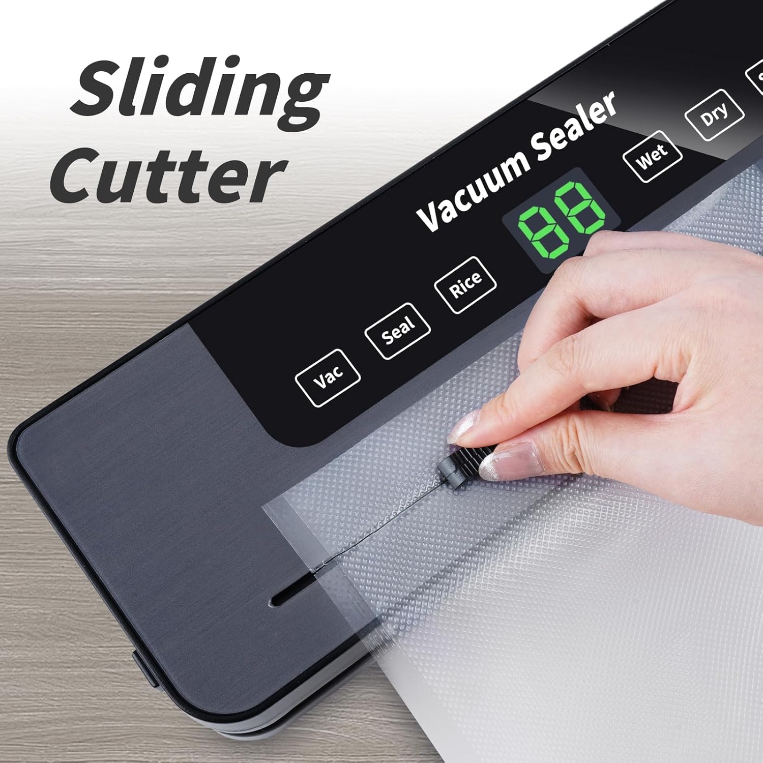 • Интелигентен сензорен екран Вакуумната машина 6 в 1 включва бутон за вакуумиране (ръчно управление на нивото на вакуум), бутон за запечатване, бутони за ориз, мокро засмукване, сухо засмукване, бутон за стоп и удобна вградена функция за рязане за лесно отрязване на вакуумни торбички.