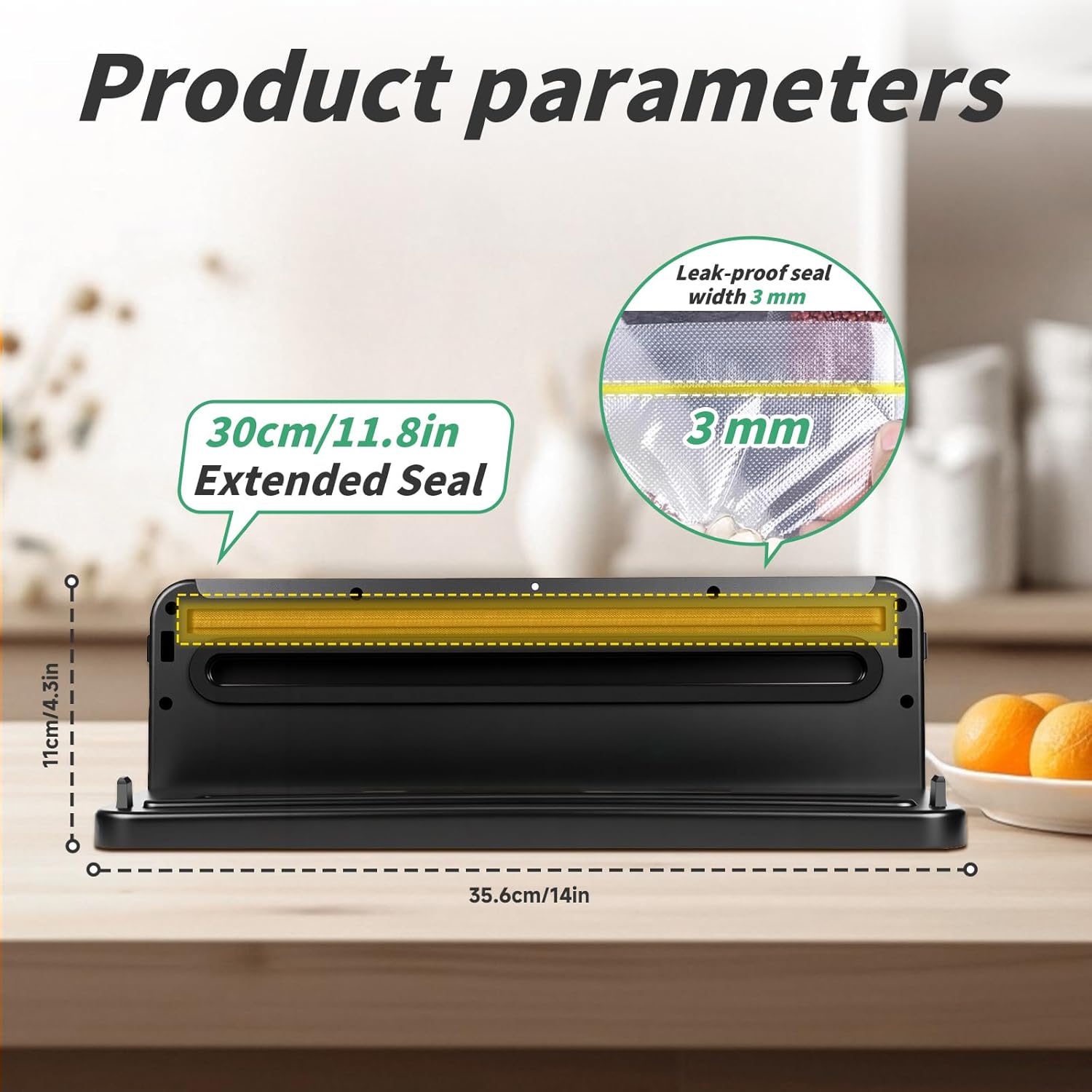 • ЕФЕКТИВНА МАШИНА ЗА ВАКУУМНО ЗАПЕЧАТВАНЕ Запечатващата лента с ширина 5 мм гарантира, че торбите са плътно запечатани без намачкване, изгаряне или загуба на въздух. С удължен заваръчен шев от 30 мм, няколко торби могат да бъдат запечатани едновременно (в рамките на 30 мм), спестявайки време и усилия. Компактен дизайн и спестяване на място.