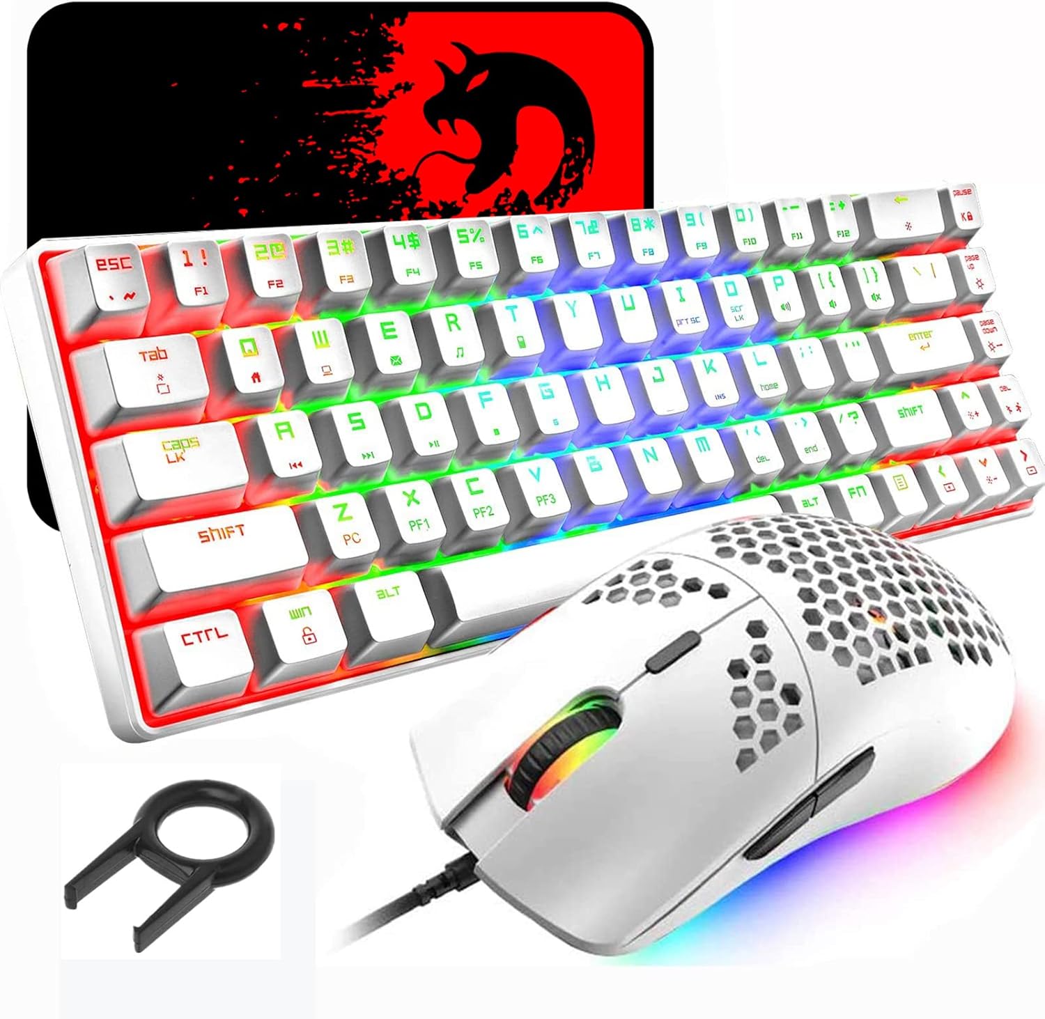60% механична геймърска клавиатура, син превключвател, мини 68 клавиша, кабелна Type-C, 18 ефекта на подсветка + лека оптична RGB мишка с 6400 DPI мишка тип „пчелна пита“ + голяма подложка за мишка - бяла
