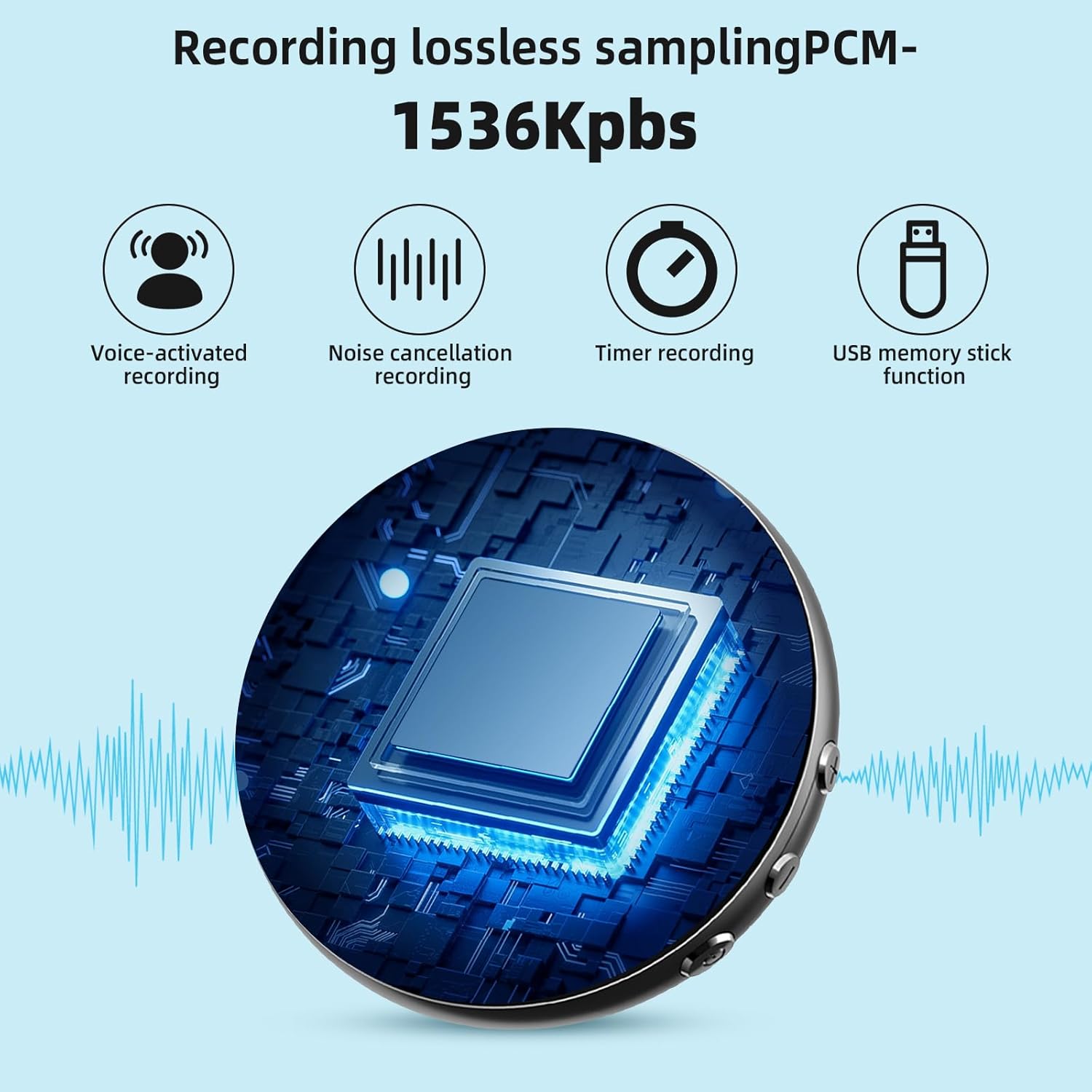 • HD звукозапис с намаляване на шума: Диктофонът с 1536kpbs е оборудван с чувствителен всепосочен микрофон и DSP технология за намаляване на шума, за да осигури ясни и реалистични гласови записи. Идеален за професионални приложения и навсякъде, където се изисква най-високо качество на звука.