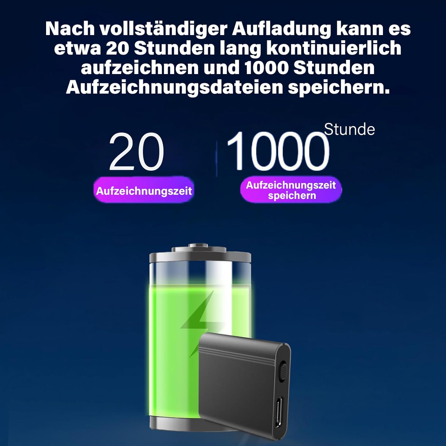 След пълно зареждане, касетофонът може да записва около 20 часа. С капацитет за съхранение от 64 гигабайта, той може да съхранява около 1000 часа записи.