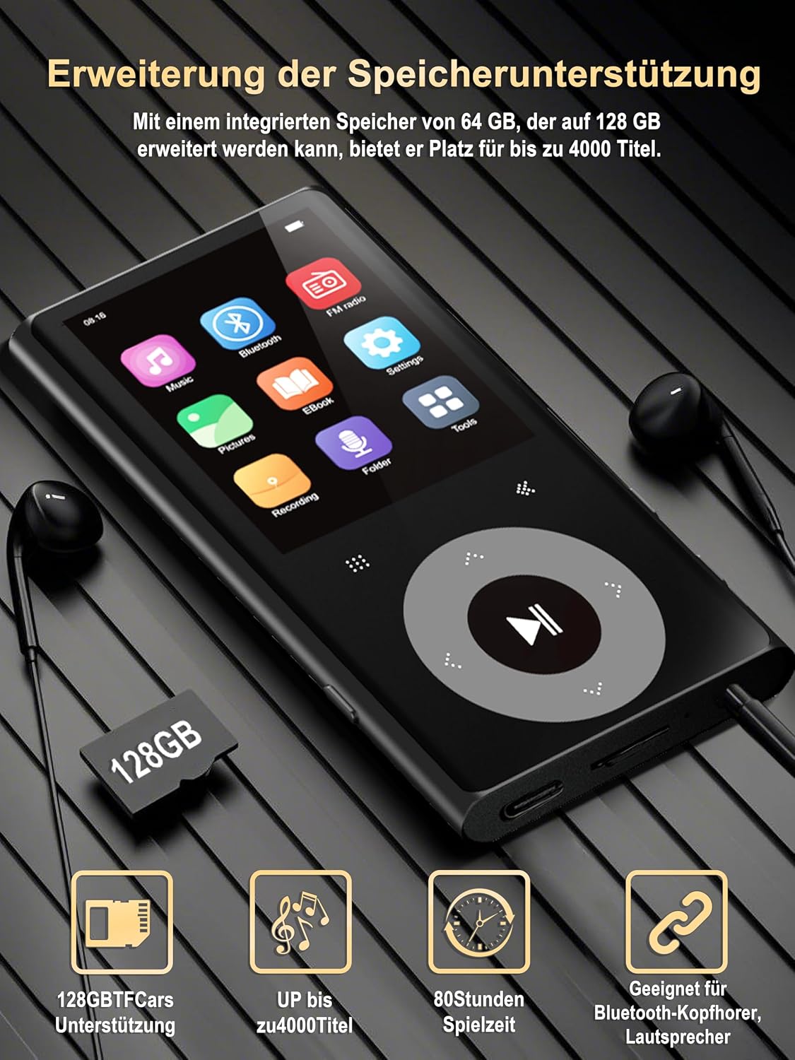 64GB MP3 плейър Bluetooth 5.3, 2.4-инчов Lossless Hi-Fi звук, преносим MP3 плейър със слушалки, високоговорител, запис на глас, FM радио, поддръжка на електронни книги, 128GB музикален плейър за спорт и пътуване