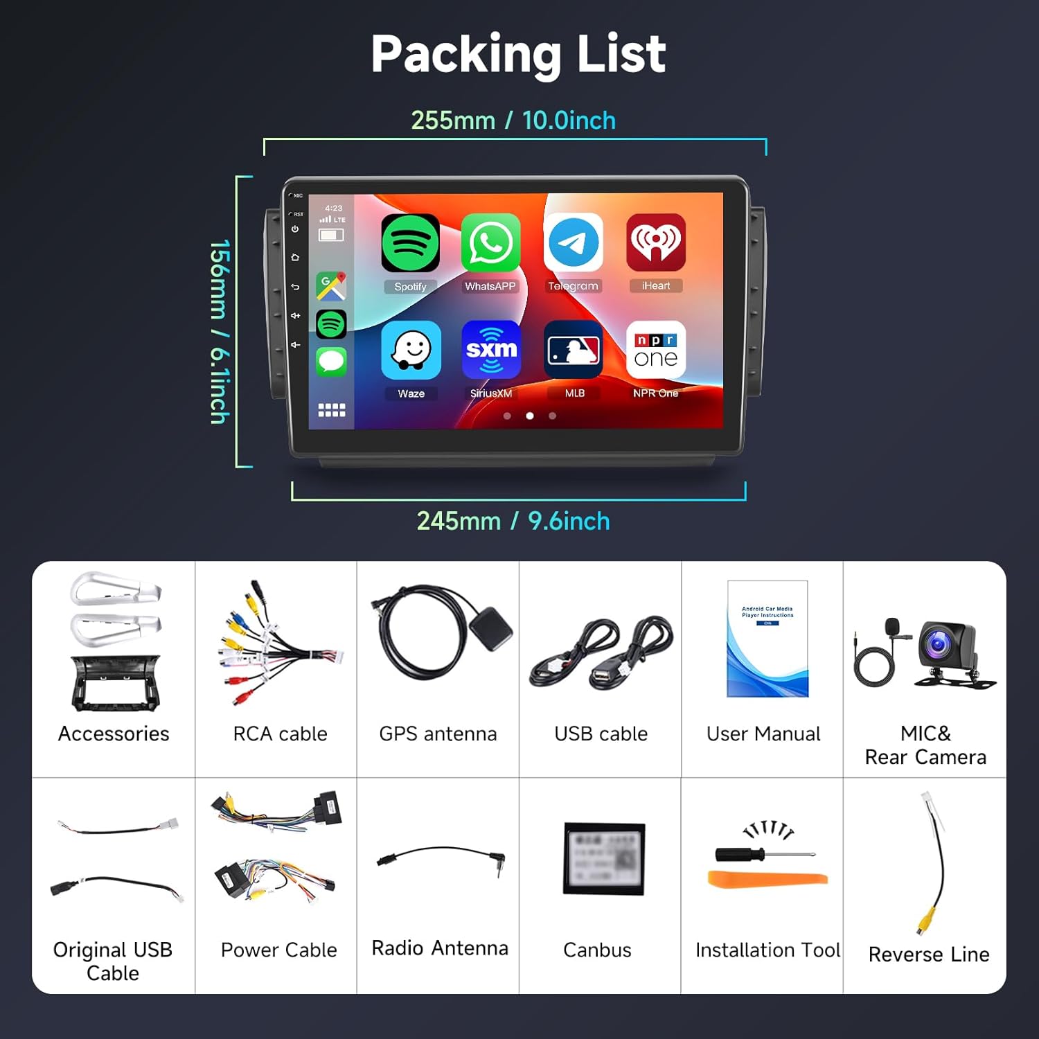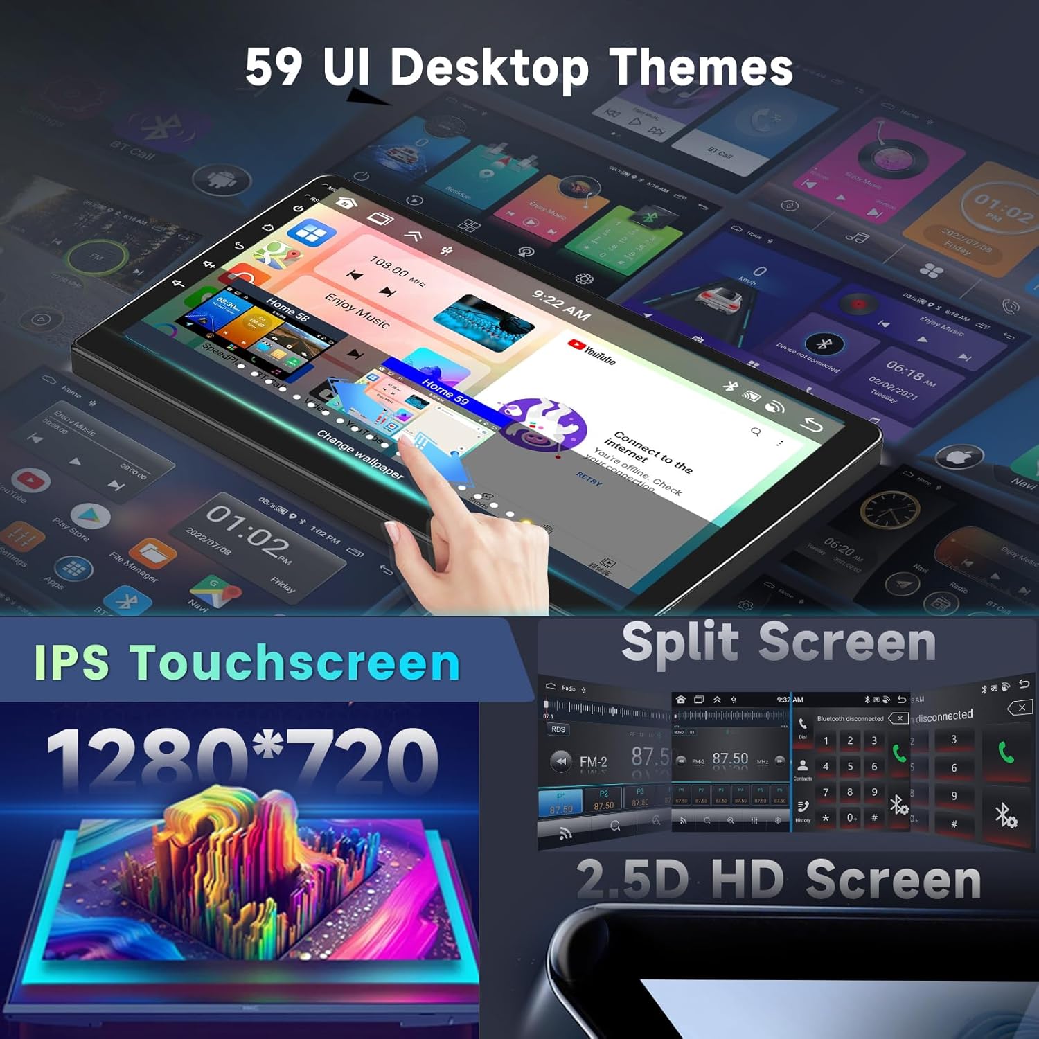 • Персонализируем потребителски интерфейс и допълнителни функции: Персонализирайте шофирането си с 59 уникални теми за десктоп и 19 различни тапети. Функцията за разделен екран предлага разнообразие от опции за показване, които могат да бъдат разделени между три екрана едновременно. Допълнителните функции включват два USB порта, поддръжка за камера за задно виждане и микрофон, управление от волана, гласово управление и AHD широкоъгълна камера за задно виждане с микрофон.