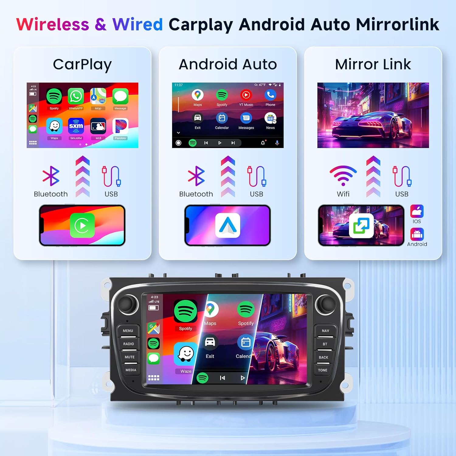 • Свързаност с безжичен CarPlay, Android Auto и Mirror Link: Останете свързани с двойното DIN автомобилно радио за Ford Focus II mk2, Mondeo S-Max, C-Max, Galaxy и разширените опции за свързване по целия свят. Функцията Mirror Link позволява безпроблемна интеграция на устройства, докато безжичният CarPlay и безжичното управление на автомобила гарантират, че винаги имате функциите на вашия смартфон под ръка и правят шофирането ви комфортно и безопасно.