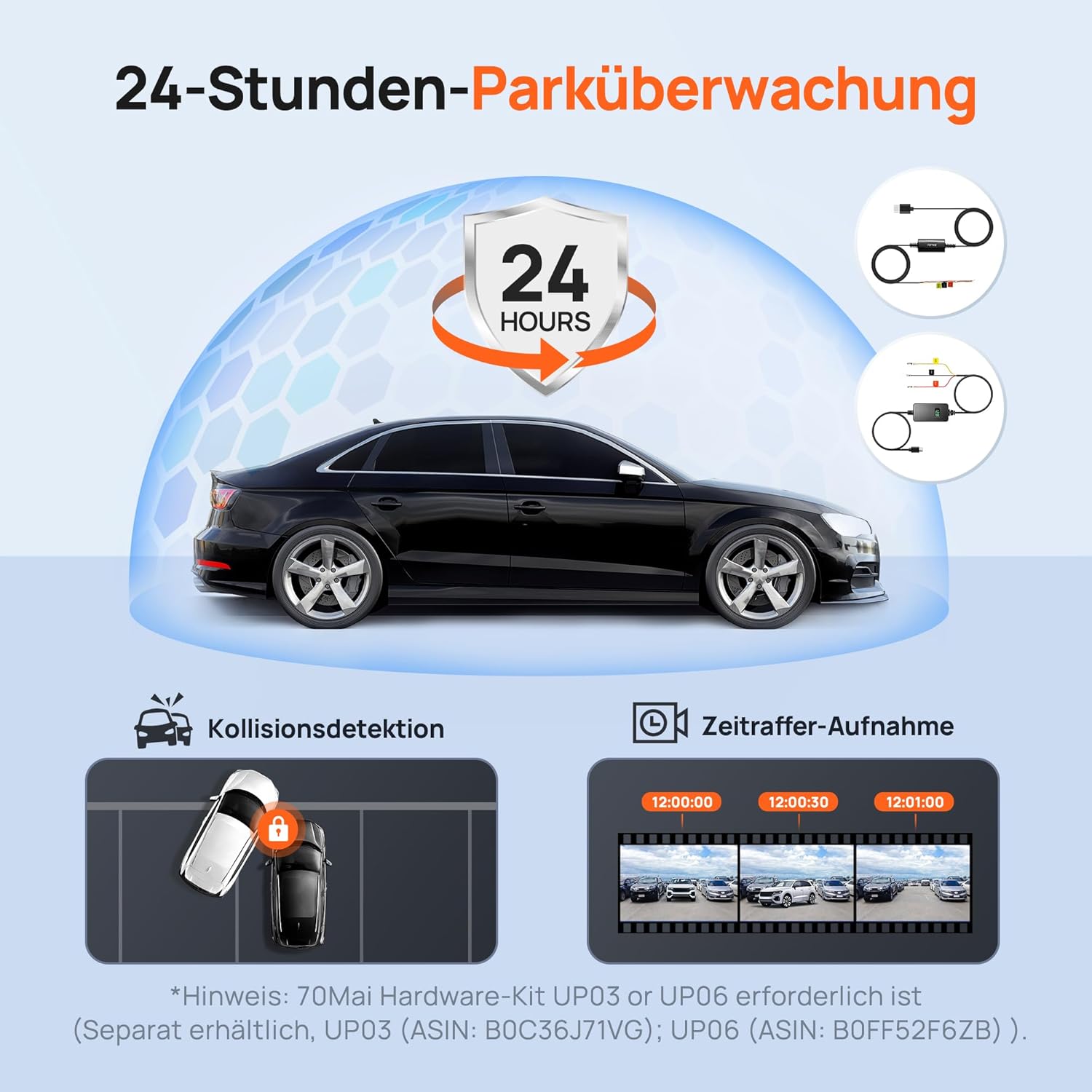 • 【24-часово наблюдение на паркирането】Когато сензорът засече сблъсък, той автоматично записва 30-секундно видео преди и след сблъсъка. Налична е и функция за запис с ускорен кадър, която компресира кадрите до 1 минута на всеки 30 минути за дългосрочен непрекъснат запис и намалена консумация на енергия. Моля, обърнете внимание, че тази функция изисква 70mai Hardwire Kit UP03 (ASIN: B0C36J71VG) или Adjustable Hardwire Kit UP06 (ASIN: B0FF52F6ZB).